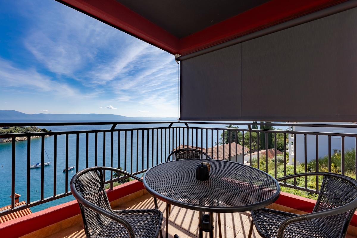 A balcony is displayed with a small round table and two teal chairs overlooking a sweeping view of the sea and coastline. Sunlight brightens the space, and a light curtain partially obscures the large glass door leading outside.