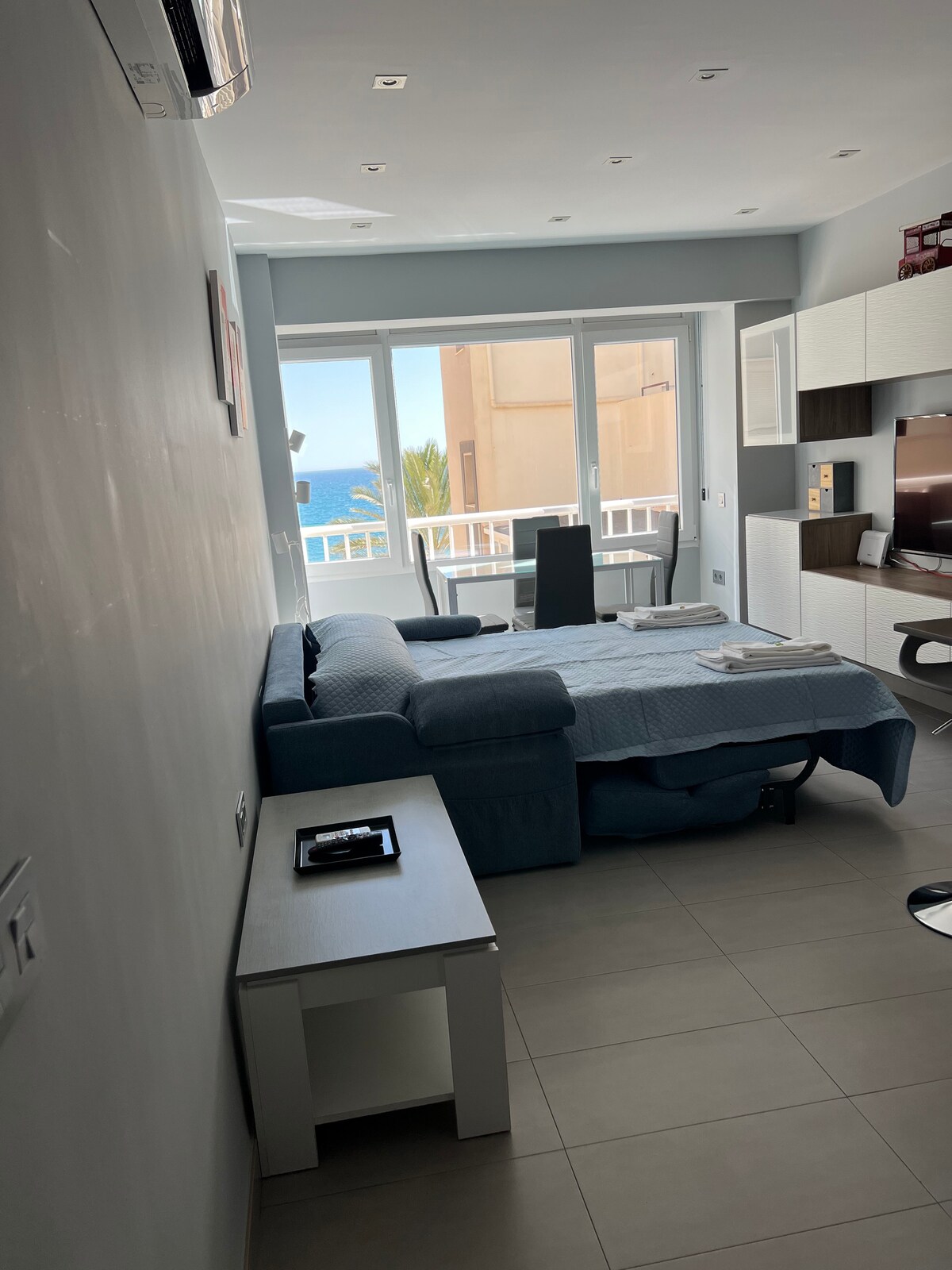 Beachfront apartment with ocean views, swimming pool, tennis court and landscaped areas. 50-meter ground floor located on the Mezquitilla promenade (Algarrobo Costa). The apartment has a fully furnished and equipped kitchen, living room with sofa bed, bedroom with double bed, bathroom, air conditioning, Wi-Fi and terrace. We include sheets and towels. This is a totally independent ground floor. From the terrace you can see the pool and the sea.