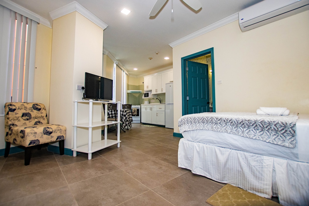 This recently built fully-furnished, modern studio apartment is perfect for couples, solo or business travellers. The kitchen is fully equipped with cooking and dining essentials, coffee maker, blender, toaster, microwave and kettle, in addition to a fridge, stove and oven. The bedroom space features a queen sized bed, sofa, work station and TV. Conveniently located in close proximity to shopping centres, restaurants, entertainment, beaches and the Maurice Bishop International Airport.