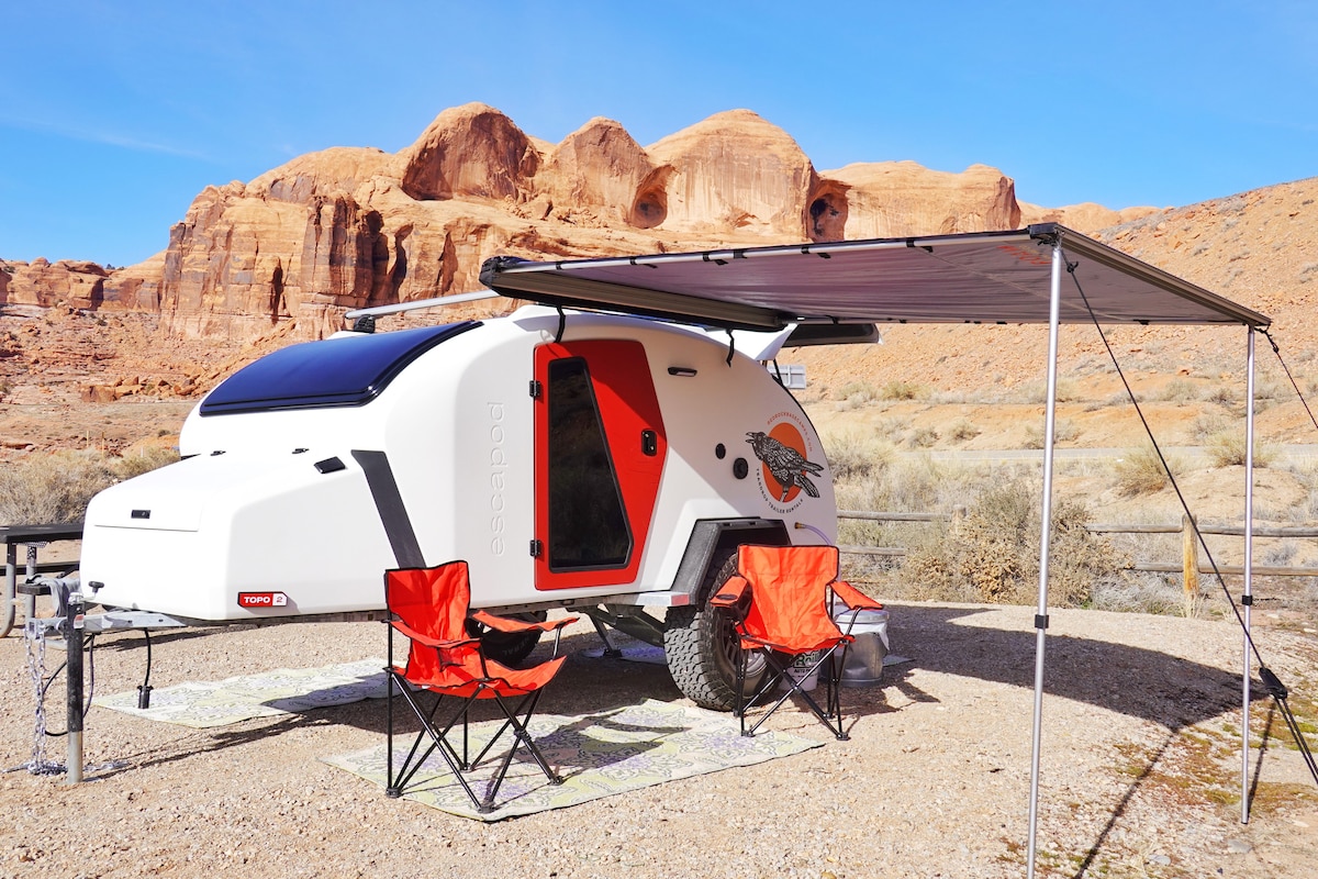 Nothing beats the feeling of spending the night in the great outdoors and there is no better way to experience Moab's amazing red rock desert. This top of the line trailer will make your camping experience a glamping experience! Greet the beauty of the desert while cooking breakfast in our well equipped outdoor kitchen. We deliver to your campsite. No need to tow! You secure your campsite and we take care of the rest.