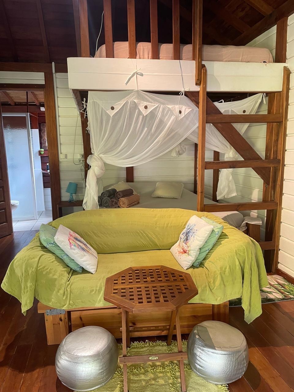 Relax as a couple in this calm and elegant cocoon: Savor the ballet of nature Create memories Enjoy full breakfast included ( with local products) Fitted kitchen Bath area with duo of bathtubs Shower Independent toilet Sleeping area with queensize bed 160×200 Jacuzzi Relaxation area available Hammocks available Buffer tank Beaches, restaurants, bars and shops nearby Massages, dinners, transfers, shopping and other wellness services at an additional cost
