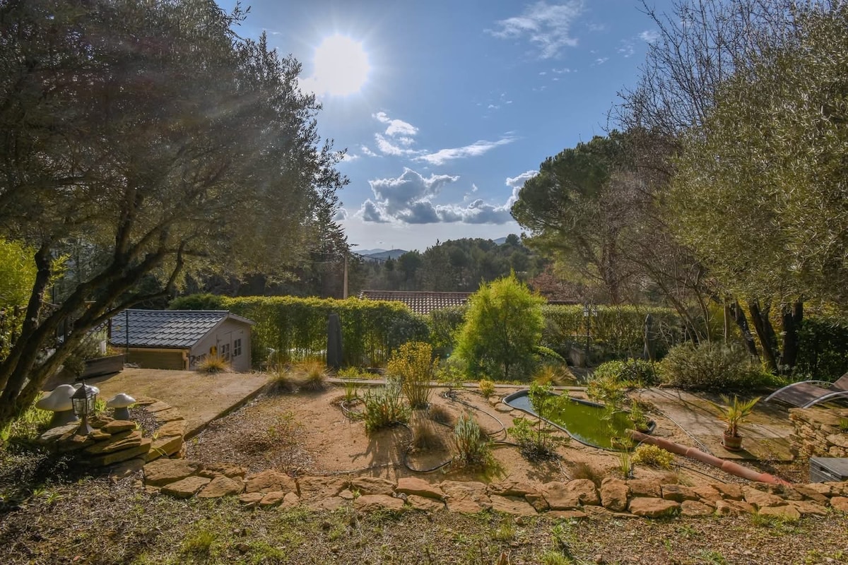 Relax in this quiet country cottage overlooking the Garlaban. It has its own garden, two-seater jacuzzi and parking. 100 meters away: access to 2 tennis courts. I paid special attention to the renovation and decoration to make it a charming and peaceful place. It has a bedroom with a double bed and a sofa bed in the living room. We are at the foot of the Sainte Baume mountain range, 25 minutes from Cassis and Aix-en-Provence.