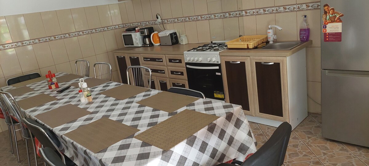 Cladirea este noua, cu etaj, iar la parter se afla livingul cu bucatarie. Oaspetii au la dispozitie o bucatarie comuna si acces la gratarul amenajat in curte. Pentru cazare sunt amenajate 6 dormitoare din care 4 matrioniale si 2 cu cate 2 paturi single, cu tot confortul necesar turistului aflat in tranzit: parcare, baie cu dus in camera, tv, internet wireless, etc.