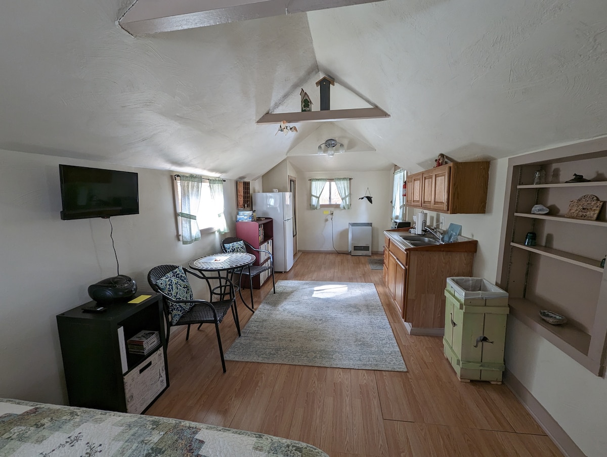 Welcome to The Bitty Bungalow, a charming tiny guest studio, perfect for those seeking cozy simplicity with all the comforts of home. It features a well-supplied mini kitchen, a deluxe redesigned bathroom, and a mini washer and dryer. My grandmother's antique roll-top desk and grandfather's original oil paintings complete the home's rustic look. While ideal for a solo or couple getaway, The Bitty Bungalow sleeps up to 6 guests, allowing families or groups to enjoy a modest retreat in the pines.