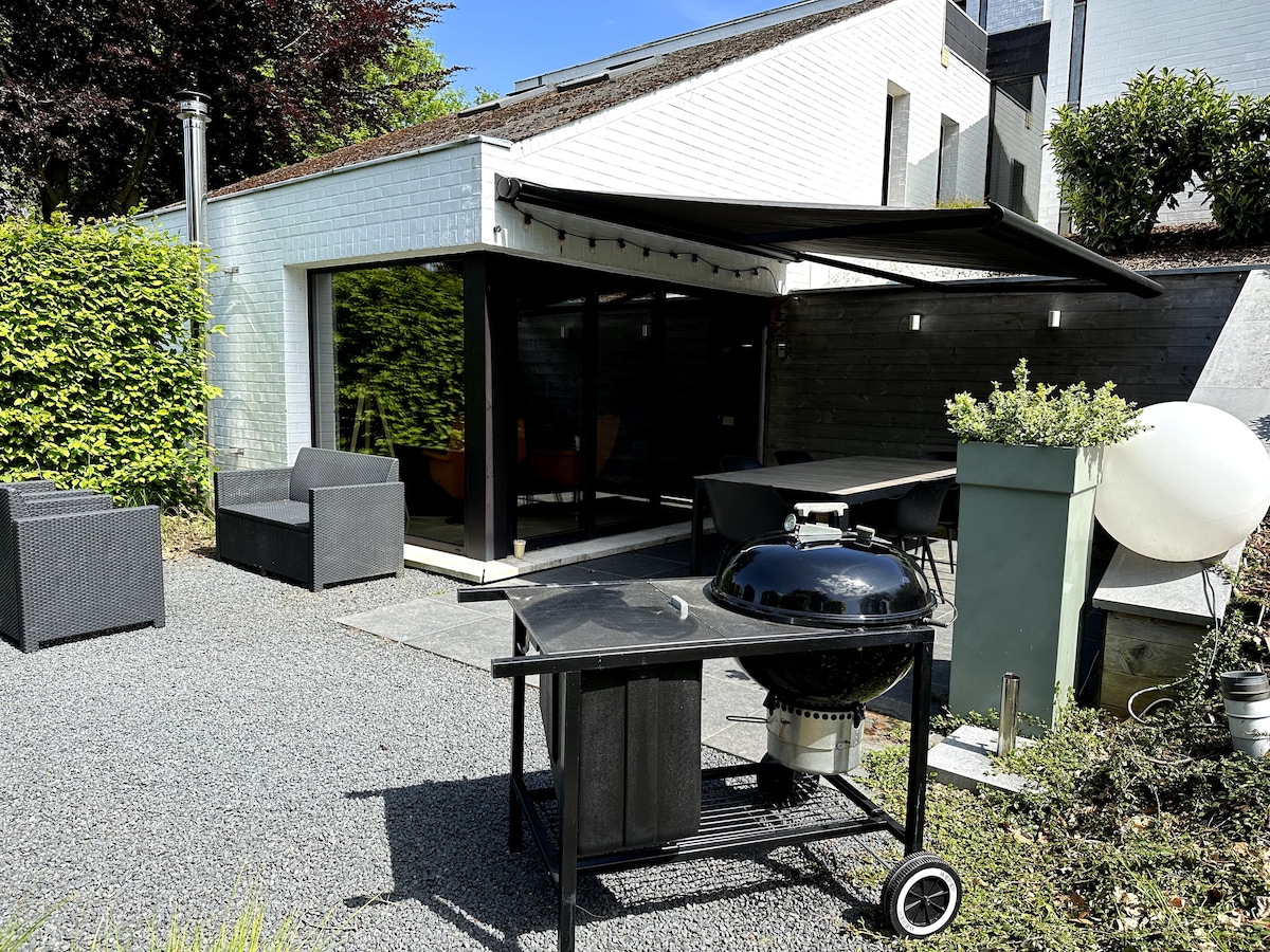 Studio 35m² (2 ==>3 people) with private access in a passive villa near LLN/Walibi. Garden, natural pool (during summer, shared use...), fitness room. Second room with separated bathroom & toilet (1-2 people) possible on request. Over 2 persons extra charge €15/p/night.
