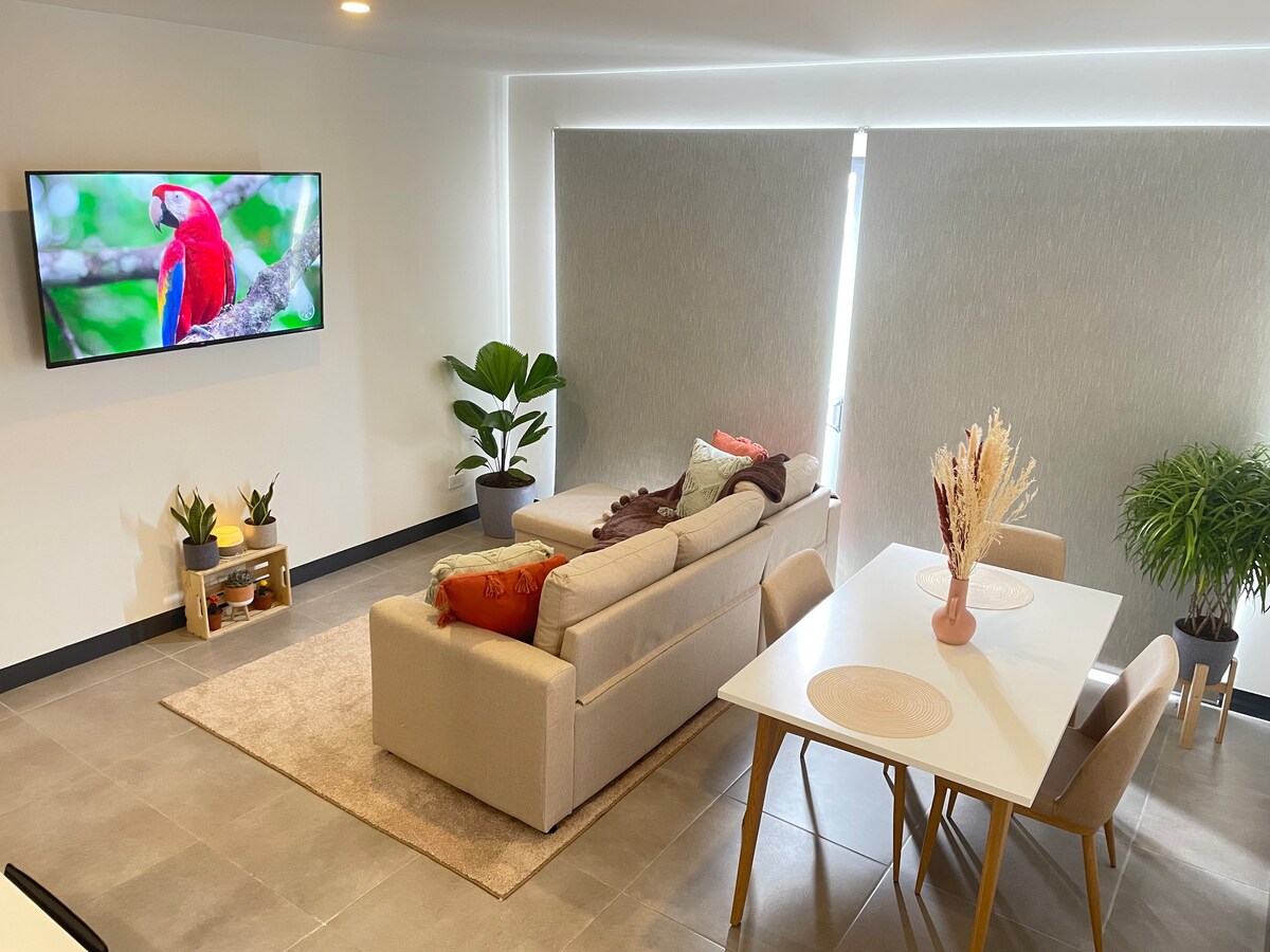 Enjoy your stay at this new cozy 2 bedroom apartment only 2 miles away from SJO airport Your stay includes: • 24/7 security in a gated new condominium • Pool • Gym • Co-working space • High Speed Internet • Clubhouse Besides SJO airport, you’ll be only 2 minutes away from the City Mall and Walmart. You’ll find in the apartment high quality Costa Rican coffee, fully equipped kitchen, Air Conditioning, a TV for each room, a King bed, a Full bed, and a super comfortable Sofa-Bed.