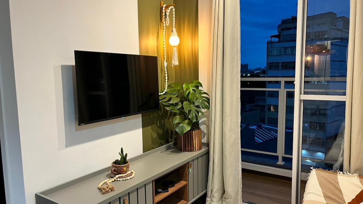 The stylishly decorated loft features an open concept with a wooden divider separating the bedroom from the living room and kitchen. It has 2 TVs, one in the bedroom and one in the living room. With a comfortable double bed, many windows bringing in natural light, a kitchen integrated with the living area, and a spacious L-shaped balcony with a surreal view of Icaraí Beach. Fully equipped, it's 200m from the beach, close to pharmacies, a market, restaurants, and the most famous street in Icaraí.