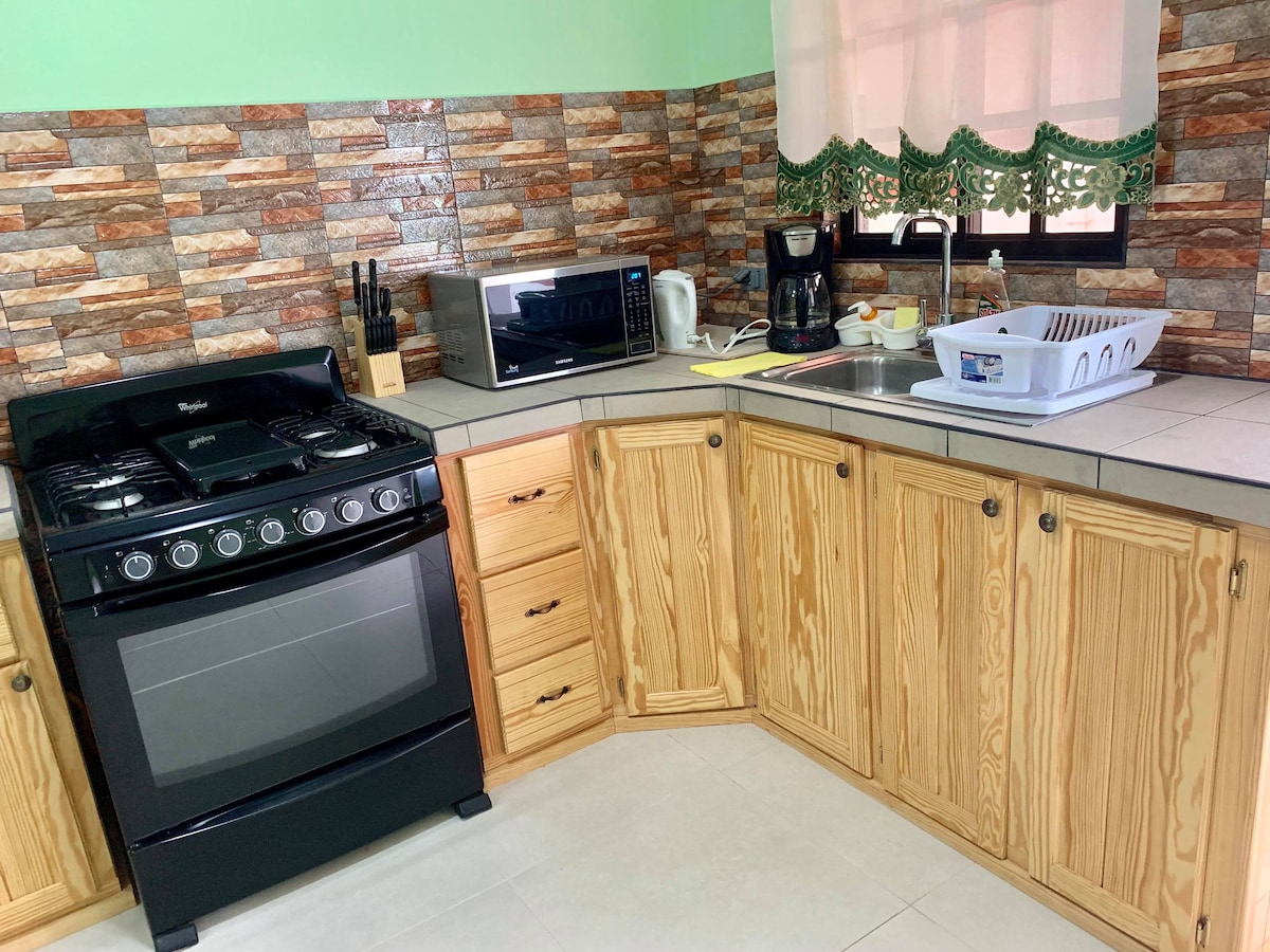 The Apartment is about a 6 minute drive to the Airport The unit includes - Electric kettle Toaster Pots and Pans,Dishes and Utensils Sandwich maker 1 queen size bed Sofabed 1 bathroom Walk-in Closet Parking for one vehicle AC Electronic gate Security Cameras Wifi H/C water TV Stove Fridge Microwave Washer and dryer Situated in a quiet neighborhood,close to supermarkets, gas station, pharmacy, fast food outlets,restaurants, schools, pubs, malls, bird sanctuary, etc. *No smoking