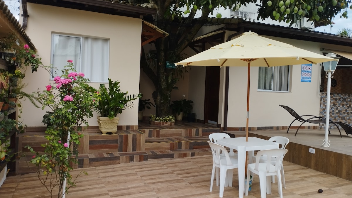 Newly renovated house, affectionately nicknamed "Recanto dos Pássaros" with an excellent gourmet area, swimming pool and fully equipped barbecue area, and 600 meters from the beach shore. Property graced with a mango tree that covers the roof, producing a pleasant internal ambient temperature, even on summer days. The host lives in the main house at the back of the property, with a separate pedestrian entrance. The unit is an exclusive environment restricted to guests. WE DO NOT ACCEPT PETS.