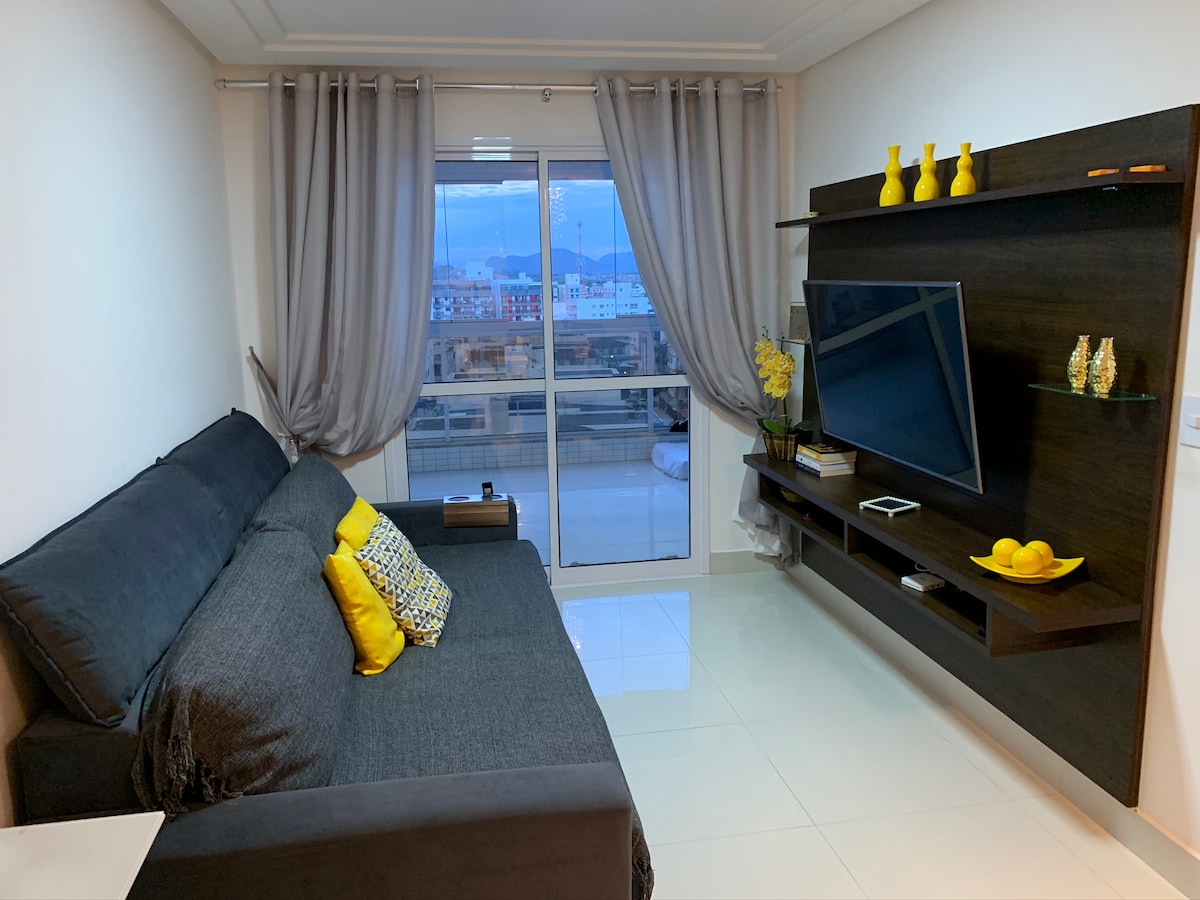 You'll fall in love with the place. Apt with lateral sea views and beautiful front views of the Mountains. 180m from the sea, from the noble part of the beach. 24h concierge, cleaning, security, comfort, 2 elevators, 2 parking spaces. 3 bedroom apto with 3 double box beds and two single beds, ceiling fans, NEW, well airy, fiber optic internet 400 MB, smart TV 50", gourmet balcony glass curtain, gas barbecue, we offer full bed and bath linens.