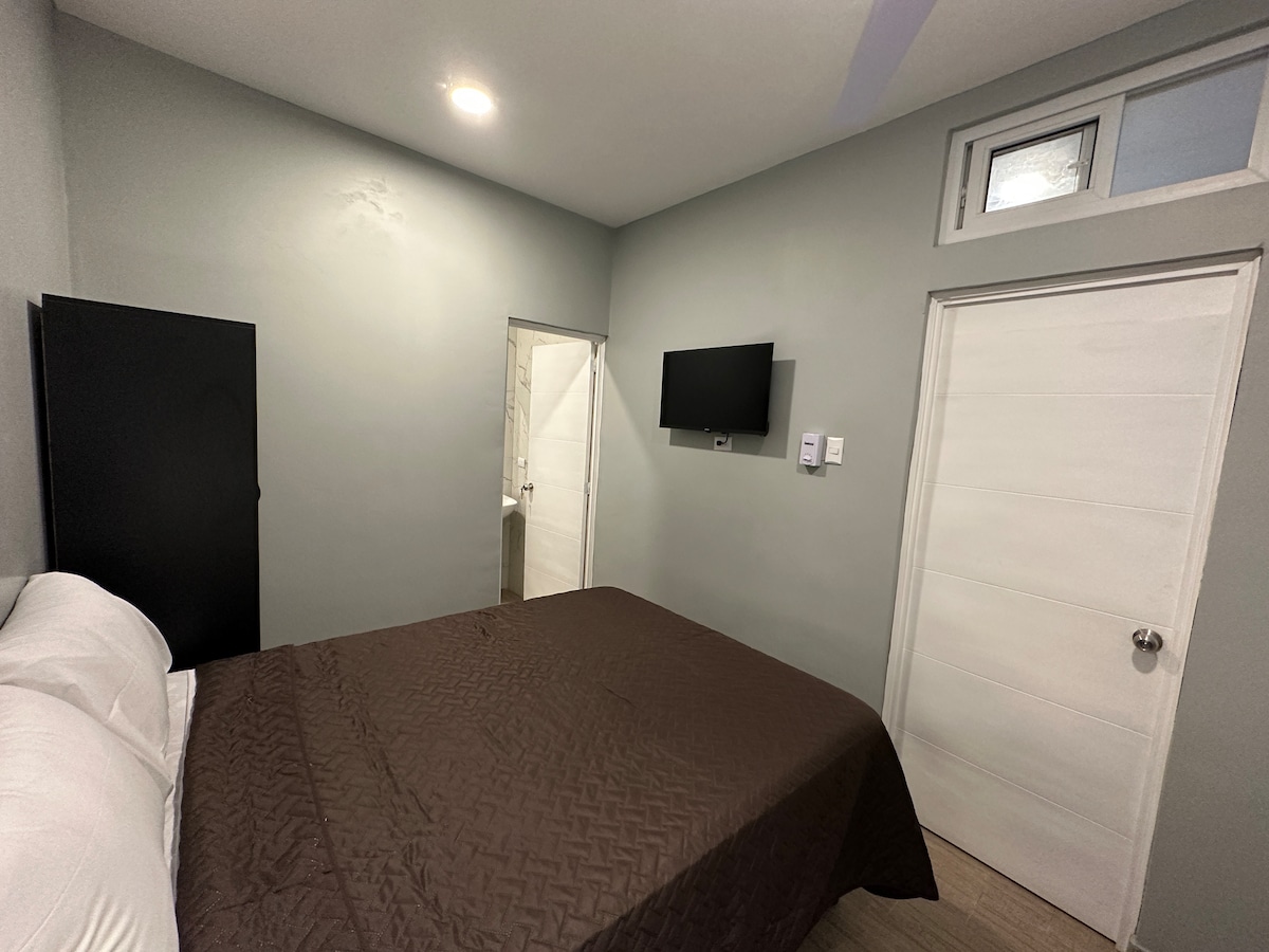 Disfruta de nuestra Habitación VIP que cuenta con 1 cama Queen, donde tendrás una estadía tranquila y un descanso lleno de confort, así como de una excelente ubicación, cerca de los principales centros comerciales y empresas de Villa Nueva.