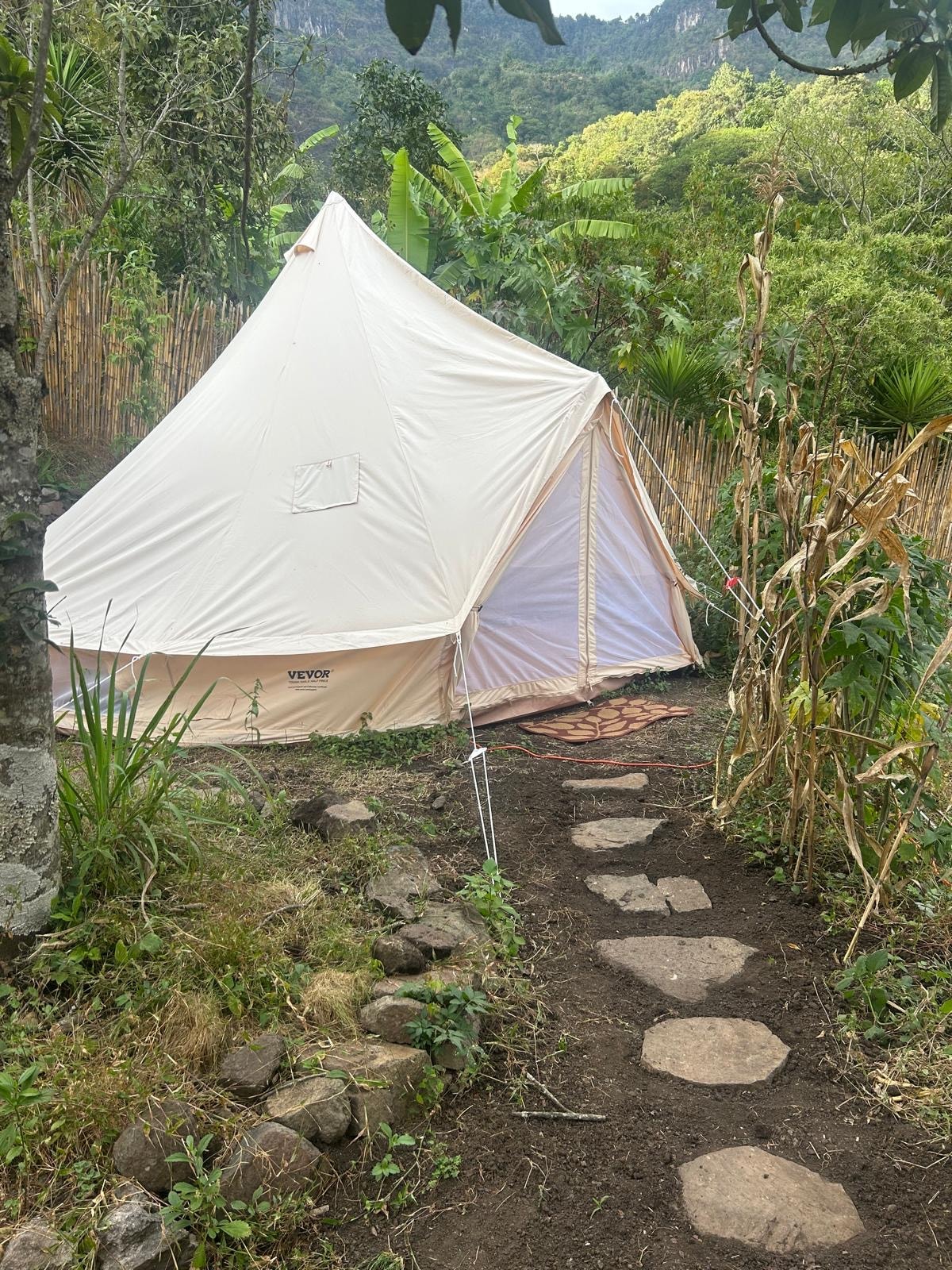 Unwind in this unique, comfortably furnished, private Stout Bell tent. Wake up to million dollar views in this 4 meter wide canvas Mcmansion that offers serenity and solitude from the crazy pueblo-noise inside of our getaway on the Volcano. Pillowtop bed, down alternative pillows and cotton sheets, screens on windows and door, gas hot water, your own private kitchen, private non-shared bathroom, hammocks, swings, fire pit, picnic tables, high level of security, Starlink wifi, net 0 property.