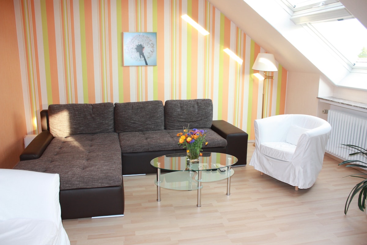 We offer our guests a newly built and fully furnished apartment in the quiet Kassel district of Kirchditmold. This is a lovingly converted attic with a separate entrance, which was recently completed and is equipped by Holzaura. Here our guests will find a living room with integrated kitchen, shower + sink & bedroom. The toilet with sink is located separately in the apartment. Internet access (Wi-Fi) & a TV are provided.