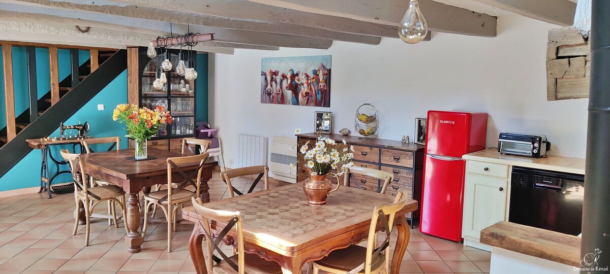 150 m² in a farmhouse between fields and woods, 20 minutes from the sea. Between Nantes and Vannes, about 30 km from La Baule, Saint-Nazaire and 10 km from Morbihan. All modern amenities for the kitchen and living room. Conservatory as a dining area for groups. 2 bedrooms, 4 beds and 8 beds with 2 sofa beds. Private spa and sauna included in the rental, portico, views of the pond with terrace, astronomical telescope, game table, ping-pong table, petanque court