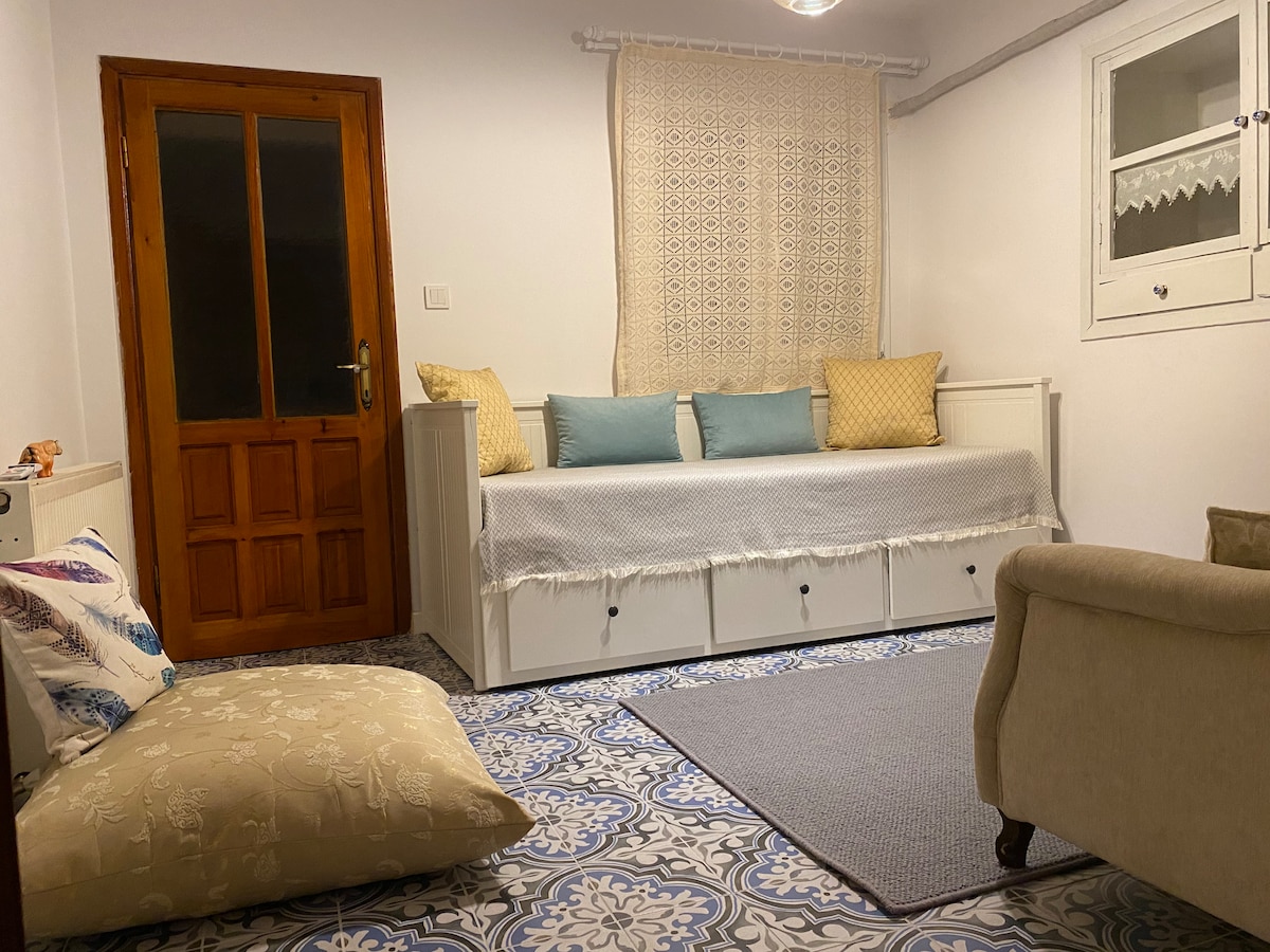 Tamamen size ait bir avlu ve kendi banyolarına ve tuvaletlerine sahip iki yatak odalı ev. Hem merkezde yaşamanın rahatlığı hem de kendi avlusu ile huzur ve sakinlik bir arada. Sanat sokağı ve Malgaca pazarına 75 metre , Bağ yolu ve denize araçla 15 dakika yakınlıktaki evimiz; sadelik içinde konfor arayan konuklarını bekliyor. Evde yatak odalarının kendi banyoları dışında bir banyo ve tuvalet daha mevcuttur. Banyolar oda içinde ve açık banyodur. Mutfağımız ayrıntılı malzemeler kapsar.