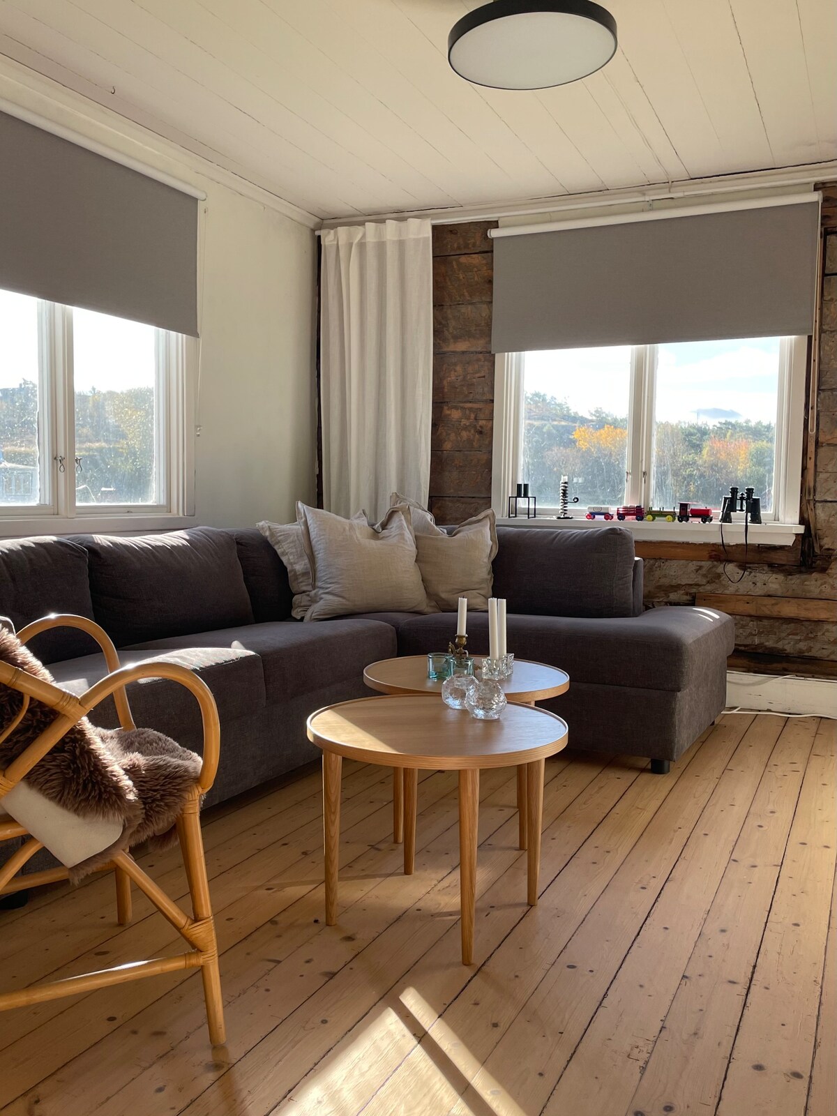 This separate cottage has a view over the sea in a secluded, beautiful countryside setting, still just 5 mins from the E6 motorway. It is recently completely refurbished keeping the old style. On first floor a living room with a cosy fire place (iron stove), a bathroom with toilet, shower and underfloor heating, a small but fully equipped kitchen, and a dining room with doors to the terrace. On second floor it is an open loft with limited height functioning as a bedroom with 4 beds in total.