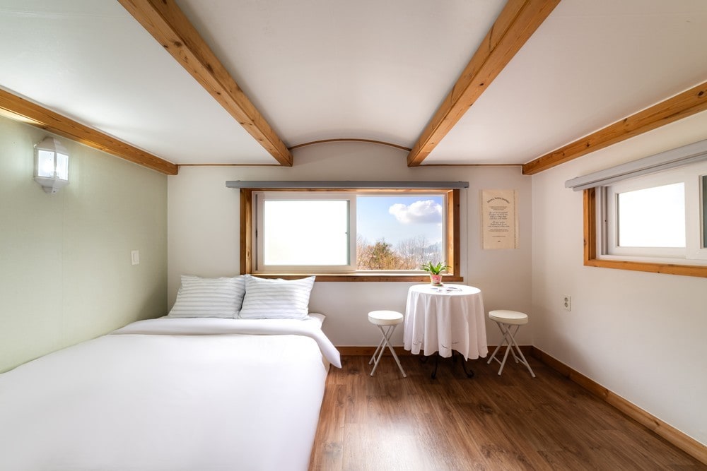 Behind you can see the pine forest of the back mountain, on the left side there is Yongju Seowon and a garden of about 200 pyeong, and in front you can see the quiet countryside. The garden is still unfinished, so we keep planting flowers and trees. On a clear day, you can see North Mountain in the distance, and you can enjoy beautiful flowers and trees according to the spring, summer, autumn, and winter seasons. It is a quiet accommodation, so you can rest comfortably. It is very independent and privacy is guaranteed without facing the front house next to the first floor. The interior is decorated with white and achromatic colors, preferring simple things. Small pets are allowed and 2 cushions and 1 food bowl are available. Beam projector and karaoke accompaniment There are two microphones, including a wireless microphone. The cloud bridge leading to the terrace and garden has been installed to make it more convenient to enjoy the garden and scenery. In the summer, there are two fans, coolers, dehumidifiers, and electric blankets. This is Deok-eun Pension, which is upgraded every day.