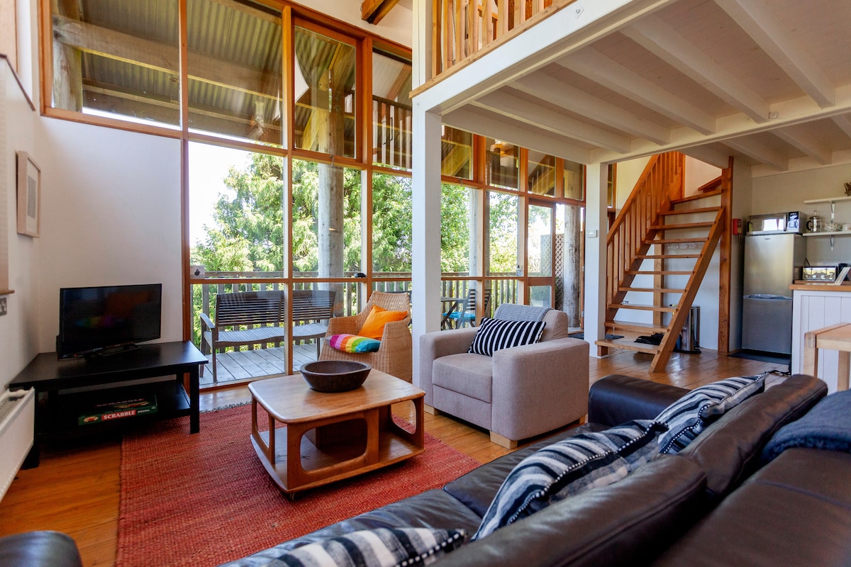 The Treehouse is an architecturally designed space for 2 with a private covered balcony running down one side with views over stunning gardens & countryside. Originally a famous printmakers studio, it is now a large, comfortably furnished light filled sanctuary. There are floor to ceiling windows, (with blinds) a large living area with a fully equipped kitchen. Upstairs is a romantic ensuite bedroom. The Treehouse is ideal for a relaxing break in a secluded location, 10 mins walk to Penzance.