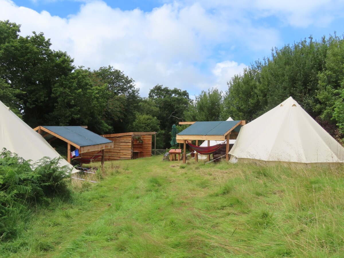 Our new pitch for summer 2023! Ideal for families or small groups of friends looking for a private, quiet, glamping experience. The fenced-in area close to the carpark comprises four large bell tents with two private composting toilets, a hot shower and a covered outdoor kitchen-living space. All facilities are for your private use! There is space for four vehicles in the carpark so invite your friends and family for a relaxing getaway in the beautiful Welsh hills.