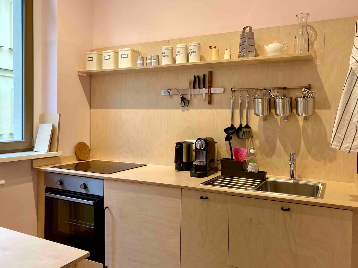Enjoy a wonderful stay in our apartment. Relax in a cozy atmosphere or work with a view of the beautiful chestnut tree. Spend great evenings cooking or relax in the bathtub with a view of the starry sky. A bedroom with a double bed (1.40m) and a sofa bed (1.40m) as well as a sofa bed (1.30m) in the living room offer the opportunity to stay overnight for up to 5 people. To get to the apartment you can easily take the elevator ☺️