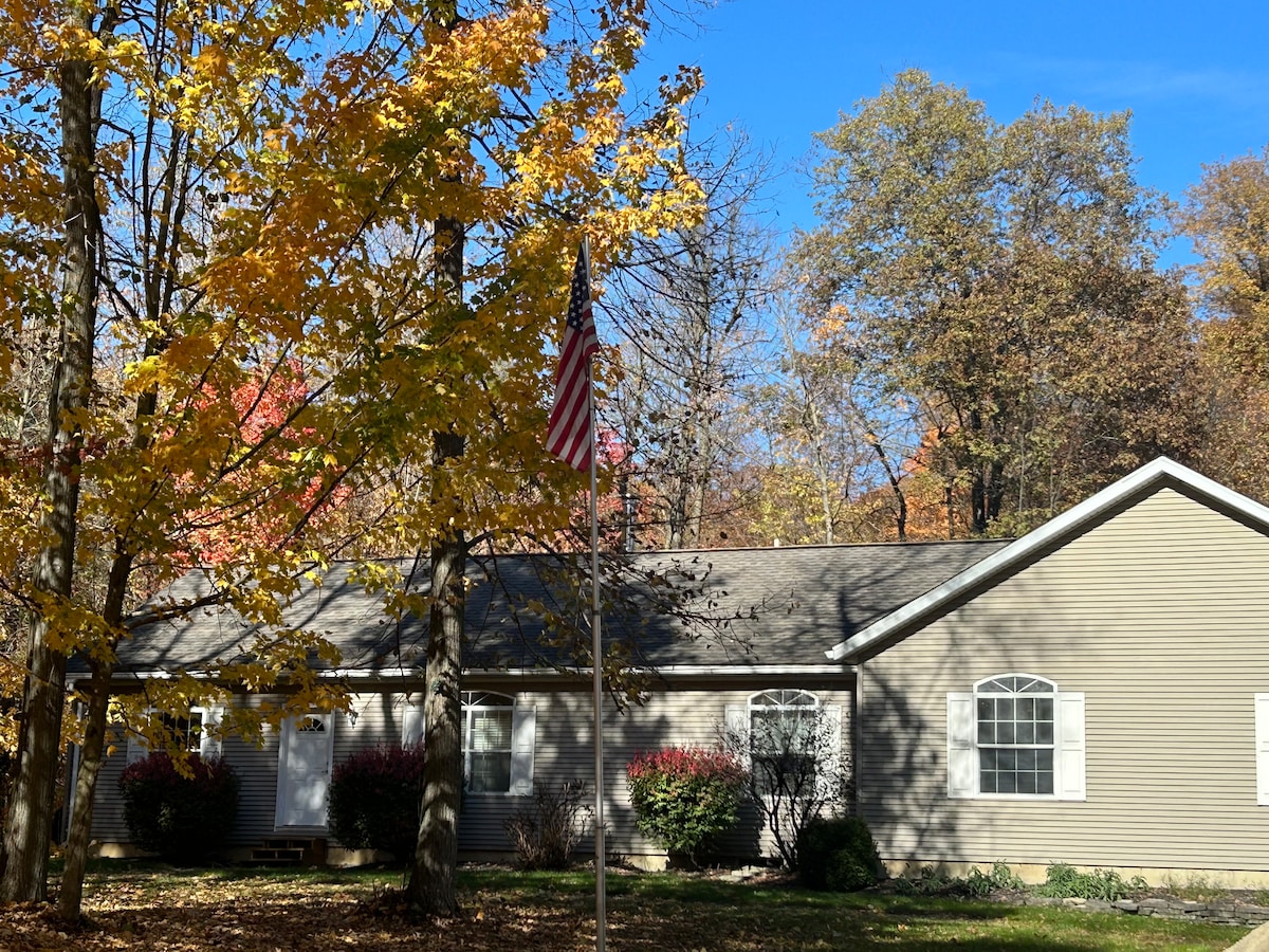 Reconnect with nature at this secluded, cozy, pet friendly escape (register pet!) nestled by a beautiful brook next to The University of Findlay. A-frame chalet with loft bedroom (queen size bed + other options), local artists' art, central HVAC heating and cooling + wood pellet stove & electric heat, large deck, patio w/grill, and private SUMMER outdoor pool. Fully equipped kitchen, private bathroom with shower, TVs in living room and bedroom, & free high-speed internet. Professionally cleaned.