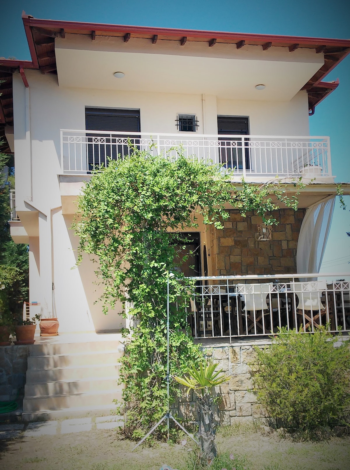 In the most beautiful part of Kassandra, right by the sea, protected from the crowds of mass tourism, a small, family complex of six residences, on the largest estate in the area, it offers privacy and plenty of space for play. In front of you is only the endless sea! The view calms and relaxes!! It is no coincidence that when we host our friends, it is difficult to get them off the veranda at night... they tell us that they are in paradise!-) it is your turn to live the experience!!