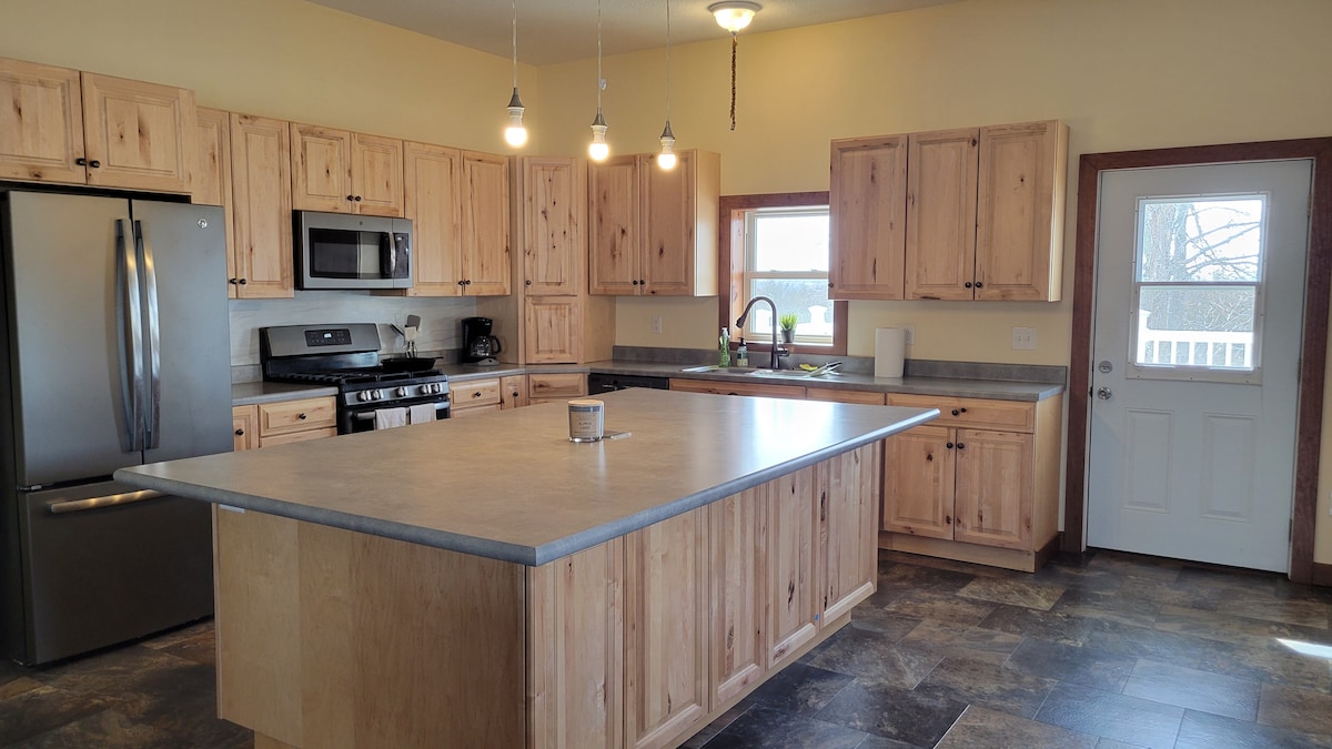 Relax with the whole family by the pond, fireplace or playing pool/ping pong. Close enough to thrift and antique shopping. 90 min to Des Moines and Kansas City.