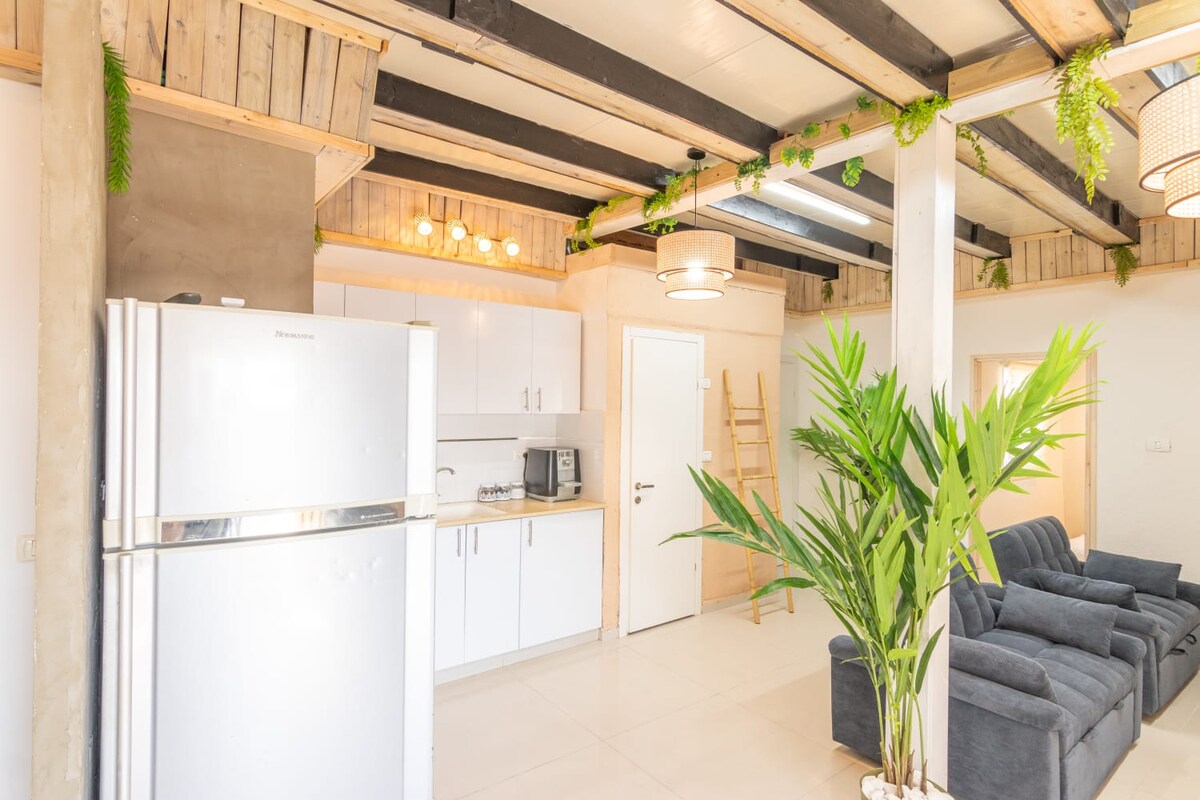 Stay in my luxurious 3-bedroom home in a quiet village in central Israel, featuring a 6-meter-high ceiling and a unique blend of upscale pop art and vintage decor. Enjoy sunrise views from the master bedroom and sunset from the panoramic terrace with a jacuzzi and outdoor shower. Includes a fully equipped kitchen, kids' room with bunk beds, safe room (mamad) with work and play areas, fast Wi-Fi, Netflix, washer, and dryer. Perfect for does who seeking comfort and style!