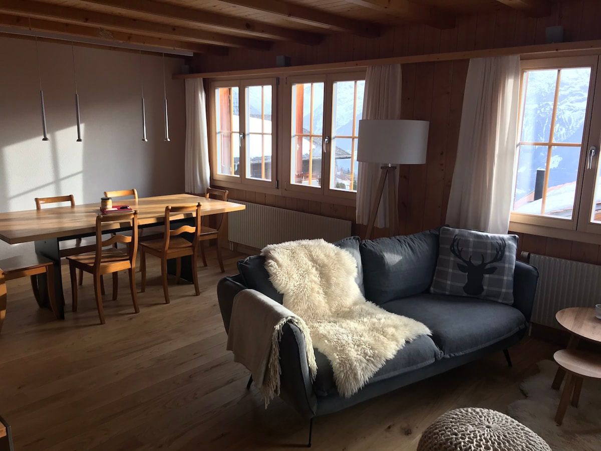 Beautiful renovated apartment with 4.5 rooms in the attic, large kitchen with mezzanine, 3 bedrooms with views of the mountains, large living room, sunny balcony with splendid panoramic views of the mountains. everything to feel good and cozy. Free parking next to the house Bus stop 2 min away. train station 7 min walk Large fenced lawn, swing, trampoline, barbecue area. We participate in environmental protection. Sort recyclable waste