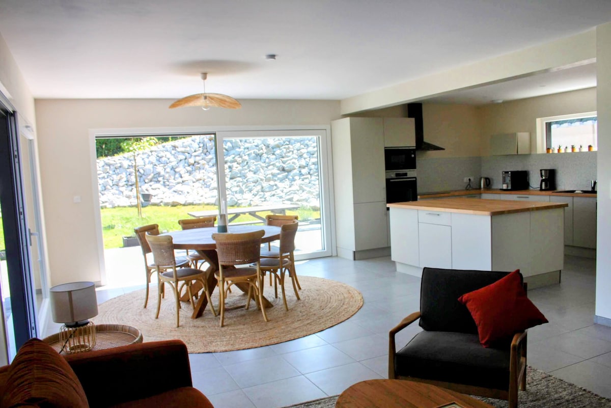 Villa with contemporary architecture, generous and functional spaces. 45 m2 living room, 3 bedrooms (200 x 180 bed) and their spacious shower room. You can live comfortably without ever losing sight of the sea. Well-equipped open kitchen, living room, facing the sea, wood stove. Back kitchen with washing machine and dryer Large satellite TV, Bluetooth speaker, Wi-Fi Spacious terrace with table, chairs, lounge area and plancha. Parking, 2 cars, with electric gate