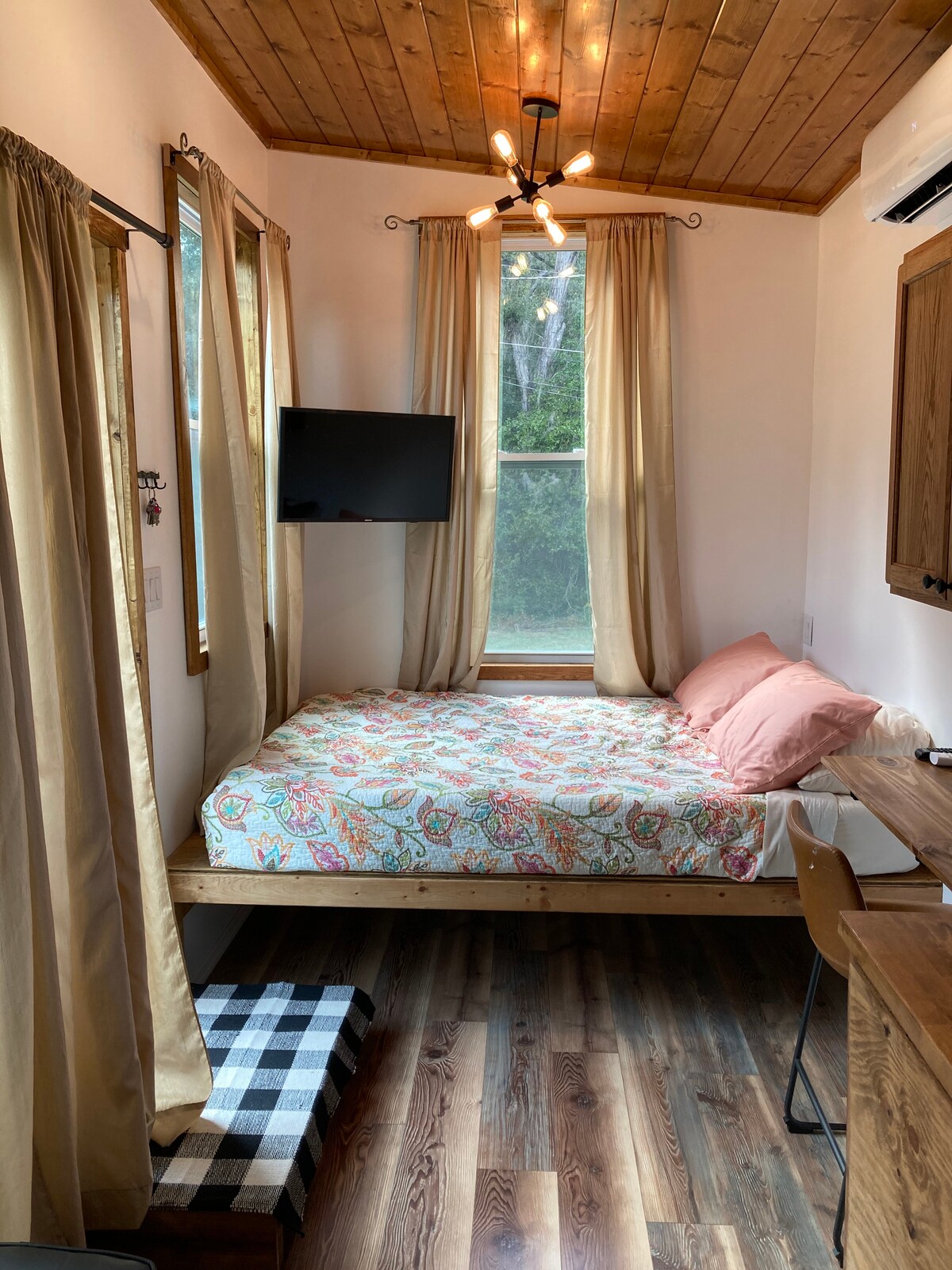 Beautifully built and decorated, Harmony Tiny house is located close to Newnan’s Lake but only a 10 minute drive to downtown. Surrounded by woods on 3 sides, it sits behind the main home on an acre of land with a small creek in the back. You have access to the back yard with an outdoor table and chairs and also a key to the utility room if you need to do a load of laundry. The sliding glass door entry faces the backyard. Please note that pets are allowed and there is a $30 pet fee.