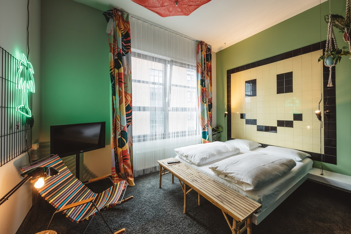 Our medium rooms may be the smallest category, but guess what!? They are more spacious than you think! There’s more than enough space for one or two people on around 20 m² with extra large windows for sunny moments. With its colourful look, the double room will take you on a trip to paradise with lots of plants for fresh air, a bright flamingo light and tropical extras to discover. The Paradise inspired design of the room will put you in the right mood to feel the boogie and take it easy!