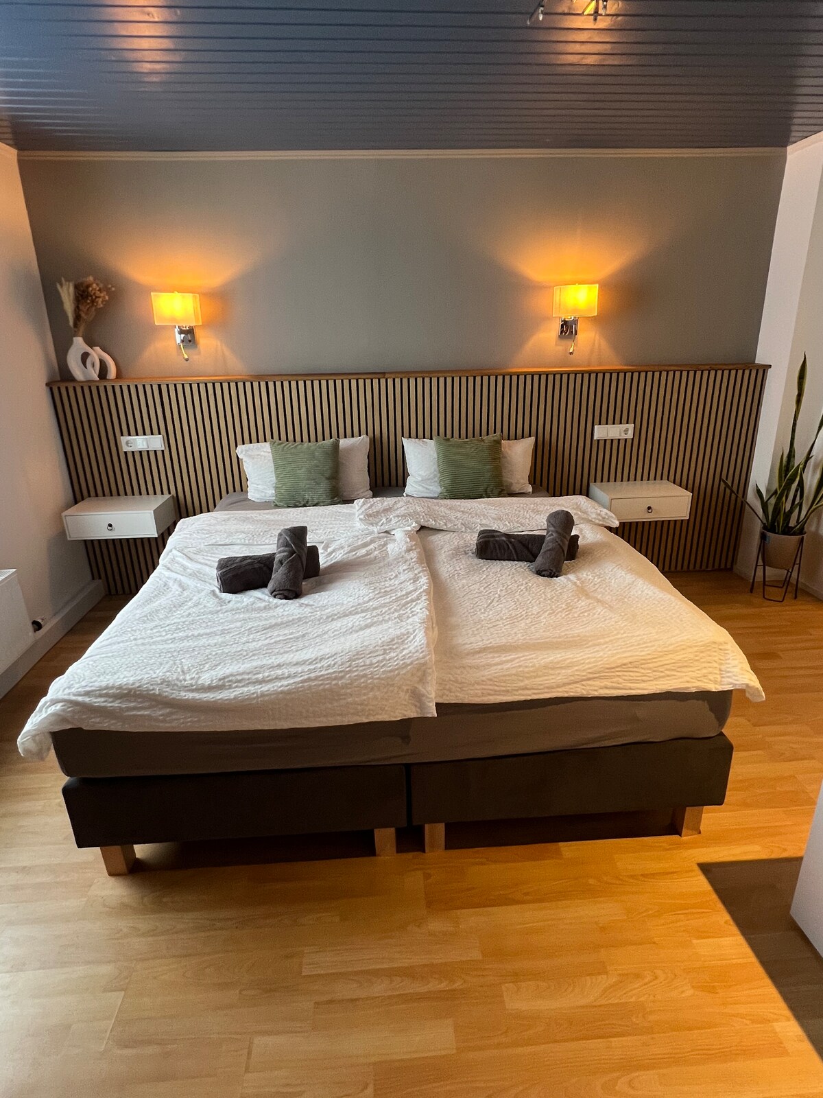 The apartment was lovingly renovated in 2021 and has 110m² (at full occupancy), with 3 bedrooms, 1 bathroom, kitchen, dining area, spacious living area and a hallway. The apartment is located in a beautiful old farmhouse with an inner courtyard. A special feature is the free WLAN with a maximum speed of 1000 Mbit/s.