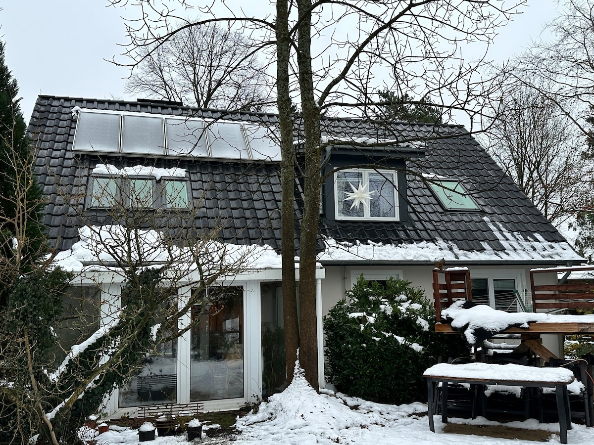 Our house is located in a holiday home area on a 3000sqm property in a beautiful little forest near Hamburg. It is easy to commute to the city by train or car. Right in front of the door there starts the Luneburger Heath with all its activities, resturants and trails.