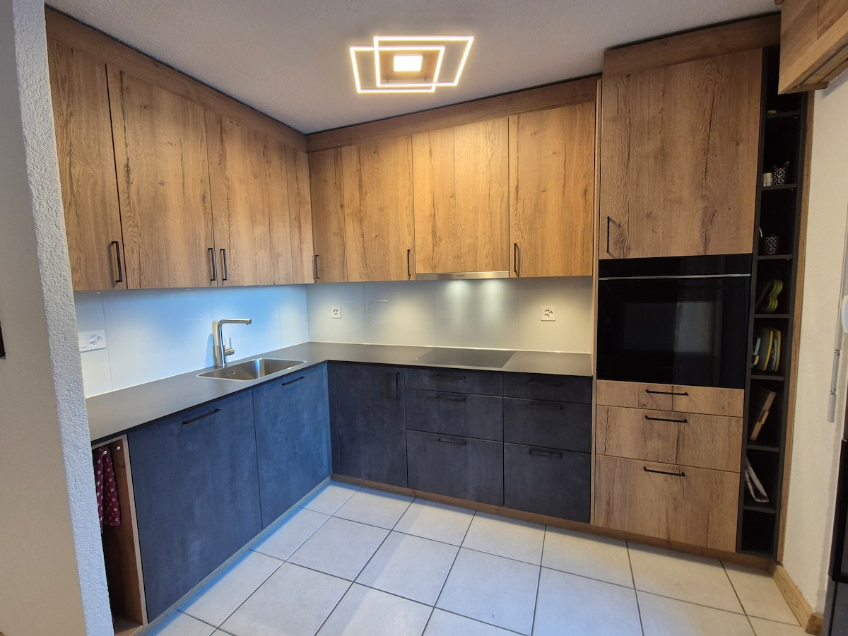 In the completely renovated apartment, equipped with all amenities, you can enjoy the sun and the view all day long; in the morning it comes through the bathroom window and then wanders around the corner before setting behind the mountains in the evening. Two minute drive to the golf course. Five-minute shuttle bus to the ski lifts. The forest at your doorstep. Lakes within your reach. It's a place for all seasons. Welcome to your mountain paradise!