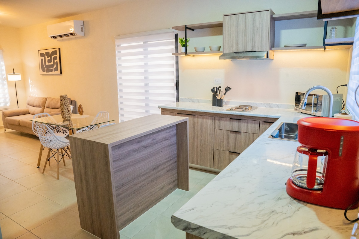 This unique accommodation has enough space for a quiet stay in the company of your loved ones. Designed for your comfort with plenty of space and amenities to make you feel at home, with internet, TV, sofa bed, a large living room and two bedrooms. Close to sights such as the American Consulate, Golf Club, and hospitals. With a supermarket downstairs, a cafeteria, a gas station, and a bank. For stays of more than 5 nights, a welcome bottle of wine is added!