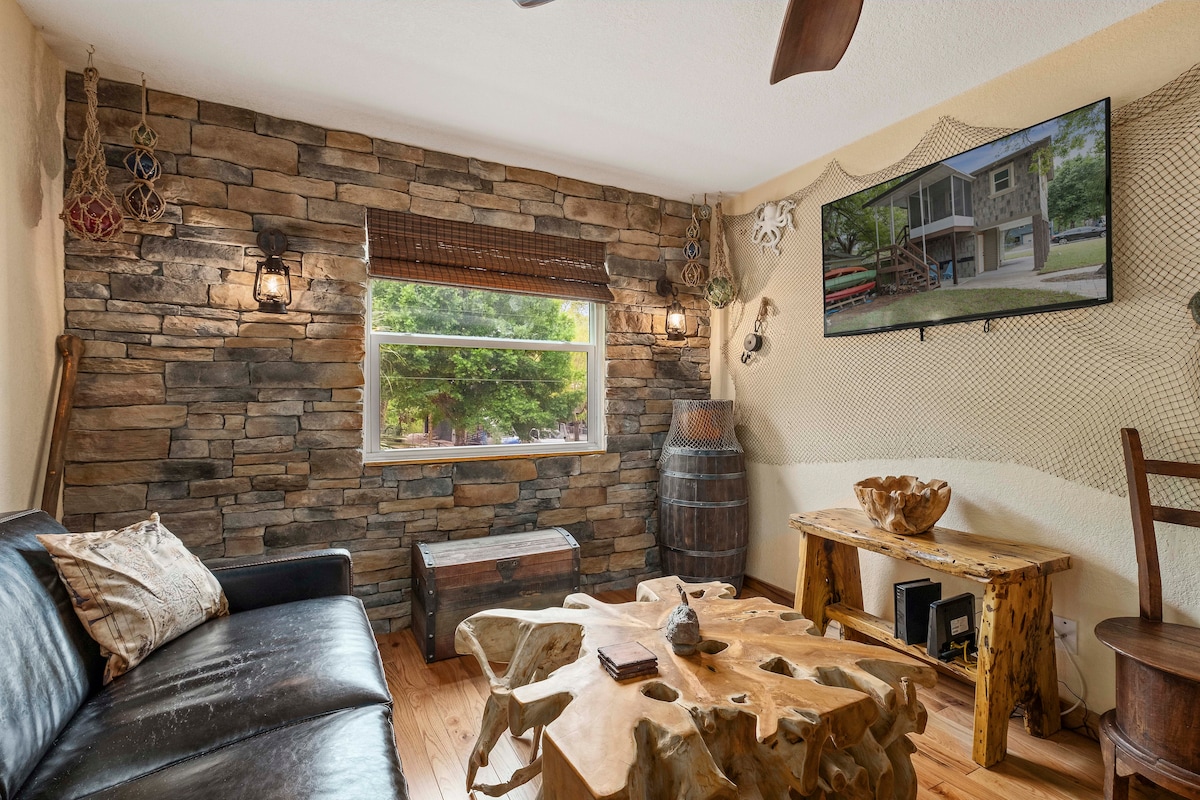 Embellish in this once in a lifetime, perfect getaway on Weeki Wachee River. A local favorite! Fully furnished pirate themed, 500 sq ft home with 1 bedroom 1 bath full kitchen and sofa bed. It has everything needed to create unique memories. Swim with manatees in the crystal clear spring-fed river. Have your coffee on the porch over looking the water and your favorite drink around the fire at night. Kayaks are included. Minutes from Weeki Wachee mermaids, Pine Island Beach and Homosassa Springs.