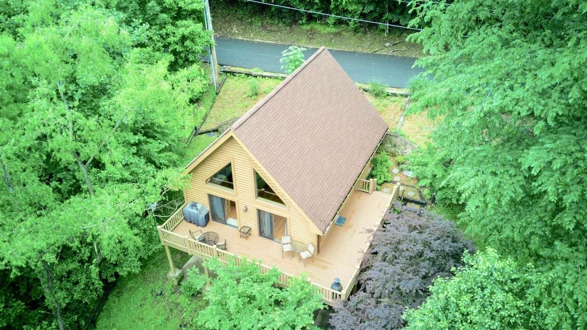 The Chalet features a wrap-around deck with a private hot tub and can sleep up to 6 people. Guests can access a shared pool and patio with a fire pit and outdoor dining area. Please note that we are not an event space. The pool area is shared with two other homes, and parties are prohibited.