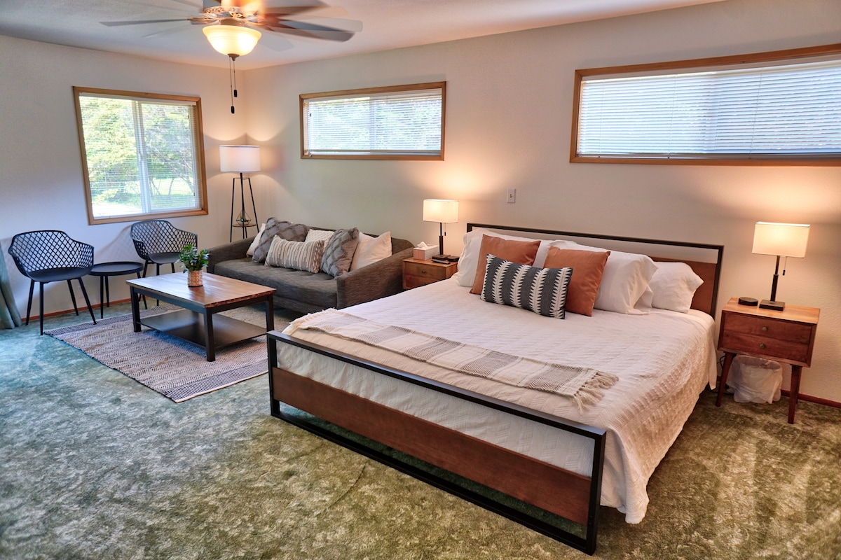 Guest suite is 2 nd story w/private access. Magical ForestCore design. Primary Bedroom w/Queen bed, 1 bathroom W/shower & living room has a queen Pull down Murphy bed , 6 person dining & Kitchenette. Air mattress also available for more than 4 guest. Were on 3.5 acres on gravel road tucked in redwoods. Ample parking ,2 min walk to Smith River,10 min drive to hiking trails & Redwood national Parks. 20 min drive to beach. Horseback riding nearby for both forest & beach rides (requires Res)