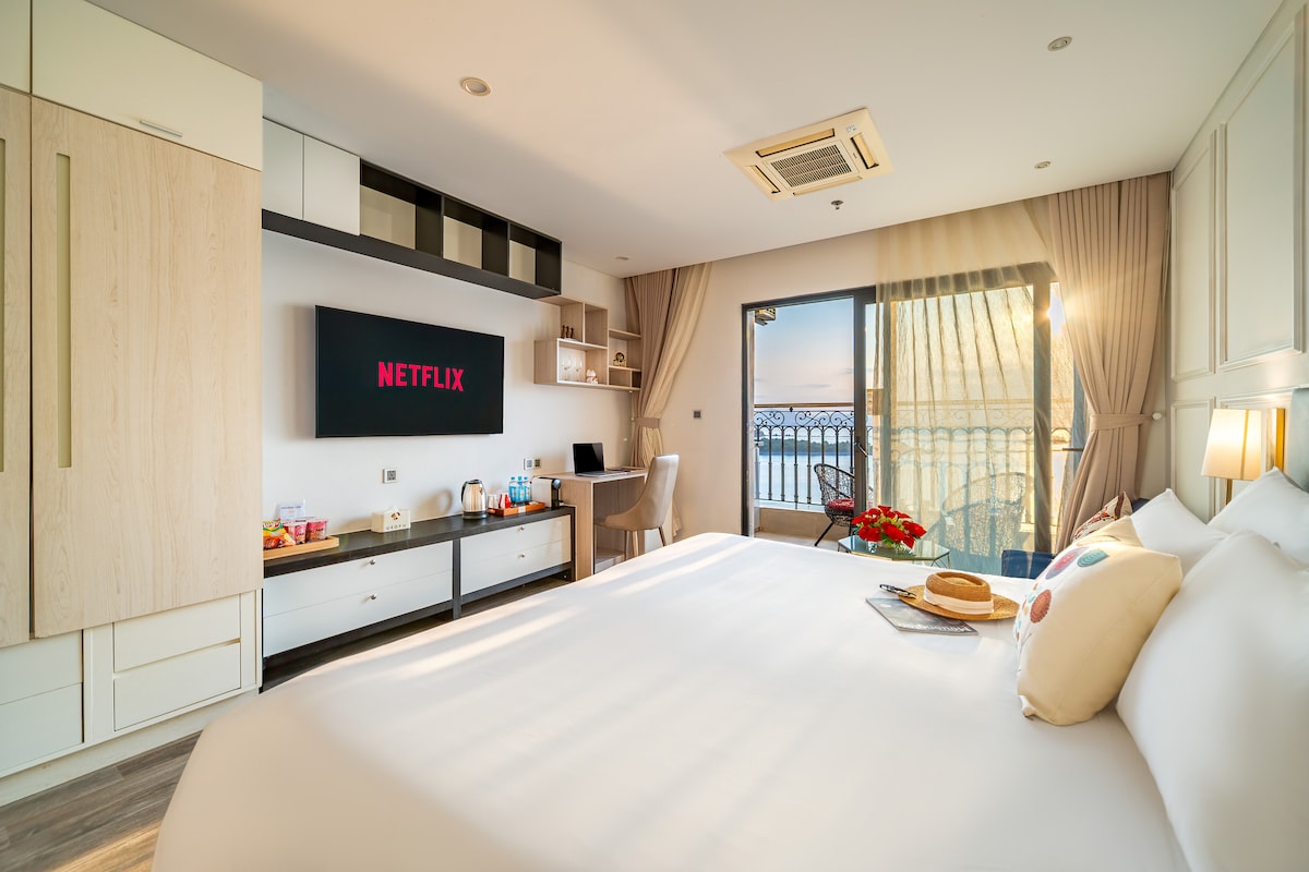 A ONE-OF-A-KIND ART GALLERY IN THE SKY — TRULY UNIQUE IN DA NANG! Spanning 140m² on the 24th floor of Indochina Riverside Tower, the penthouse overlooks the Han River, Dragon Bridge, and city skyline, with soft sea hues along the horizon. From your balcony, watch cruise ships glide by, Han Bridge rotate, and Dragon Bridge’s weekend fire show. On bustling Bạch Đằng Street, steps from Han Market, with housekeeping, pool, gym & table tennis, ideal for families, business guests, and long stays.