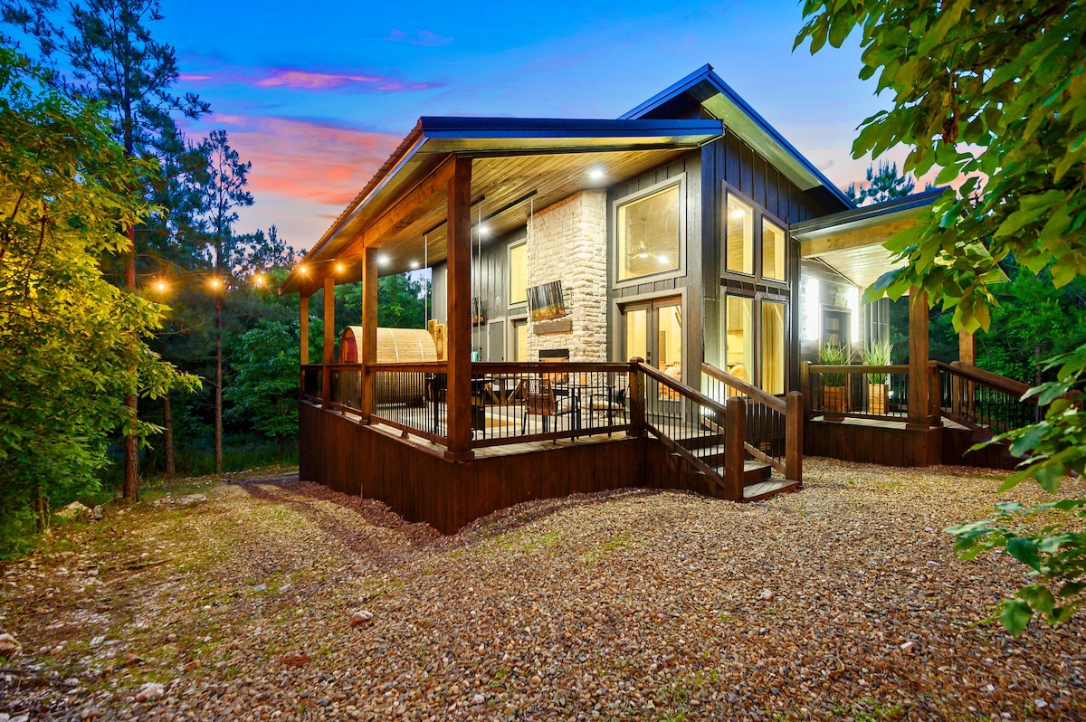 Tuklo Tiak, Choctaw for "Two Pines", is a luxurious cabin nestled among pines, offering the perfect couples retreat. With indoor/outdoor fireplaces, a hot tub, sauna, and fire pit, it provides relaxation and connection. Located between Broken Bow and Hochatown, it offers privacy and tranquility, yet is minutes from dining, shopping, and attractions. Experience a peaceful escape you'll want to revisit, with every detail designed for comfort and serenity—perfect for creating lasting memories.