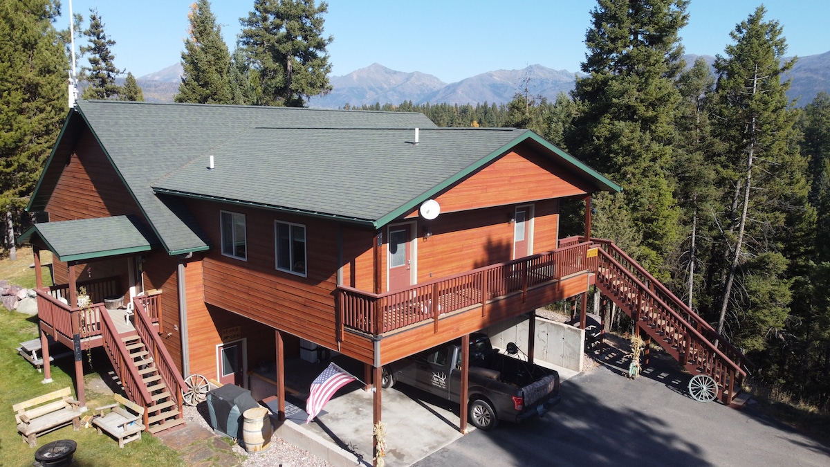 The Whitetail View, an entire upstairs living area with private outside entrance. Montana decor. Queen log bed in bedroom, queen cabinet bed in living area that folds away. Wet bar/food prep. Private propane grill. Yard: 2 picnic tables, swing, benches. Plenty of parking with trailer options. Awesome mountain forest view, including shared hot tub observation deck! (1st come/ 1st served) 1/2 mi from lake and trails, 3 miles from Double Arrow Golf Course, and 3/4 mi from 18 hole disc golf.