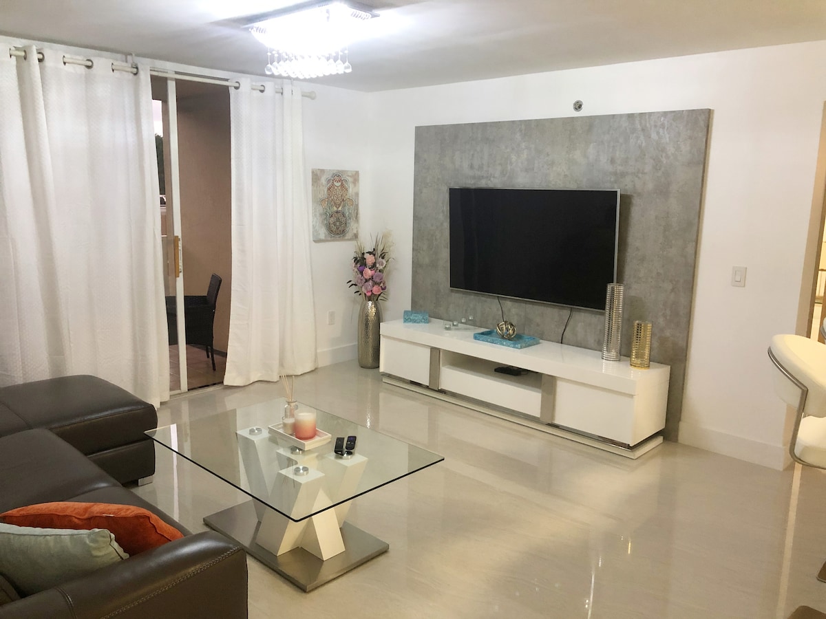 Huge, Fully-Furnished, Clean & Cozy Residential Living Space, perfect for longterm stays. 3.9miles from HardRock Stadium, in close proximity to major highway on-ramps, Beaches,Casinos and Downtown Miami are 15-20mins away. Private Entry/Bathroom Queen Size Bed W/High-Quality Sheets 50inSmartTV Kitchenette W/StainlessSteelAppliances FASTWiFI Gym Washer/Dryer Huge backyard with screened in patio for outdoor Yoga&Meditation. Grocery stores/restaurants are minutes away. Free SecuredParking