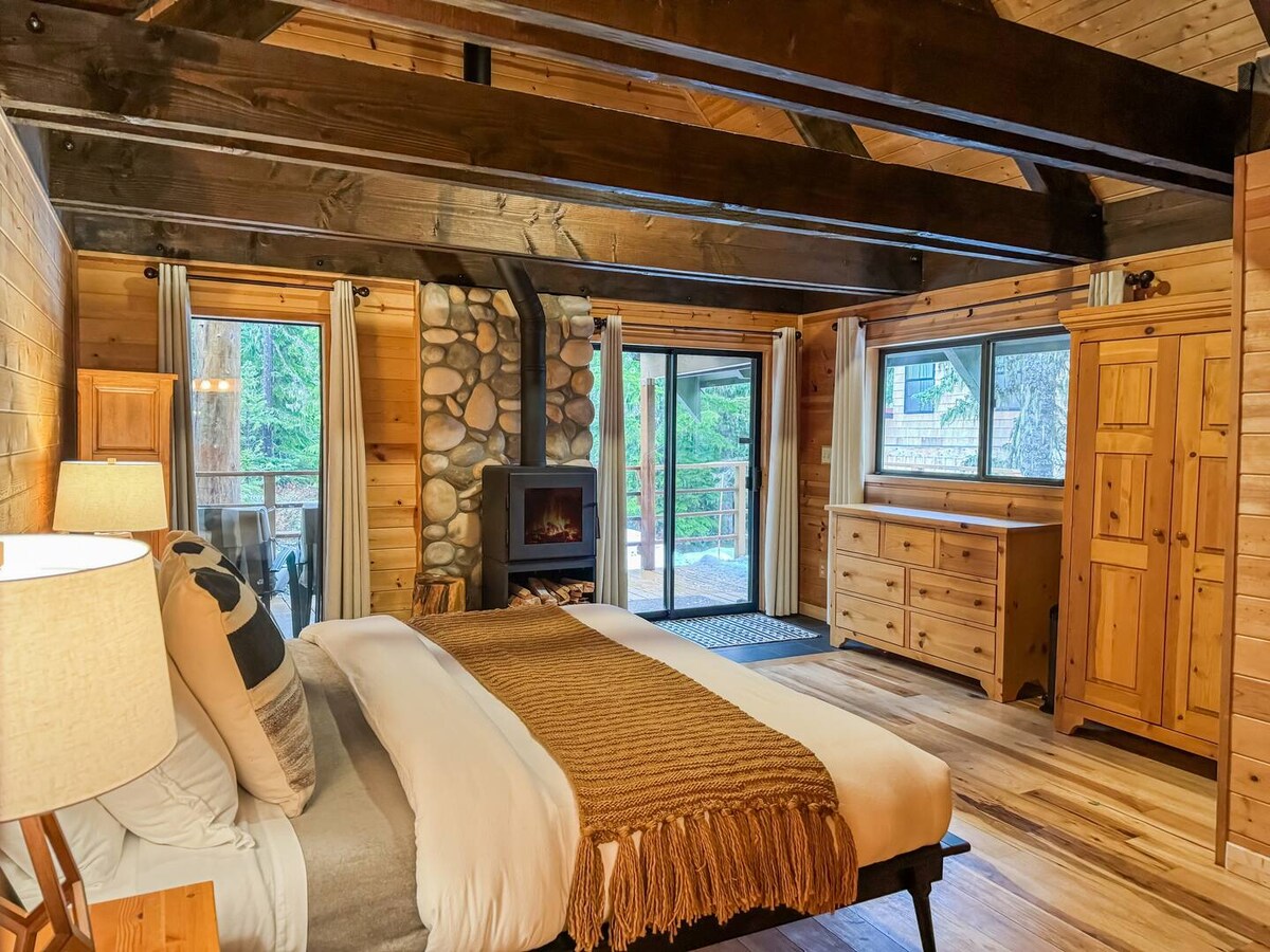 Tucked into the trees on a quiet Stevenson hillside, with Cascade Mountain views right from your patio — Skamania Lodge is a 5-minute drive, downtown pubs are 7 minutes on foot, and back here, the trees and mountain views are entirely yours. This isn't just a place to sleep — it's where your immersive Gorge adventure actually begins. Gas fireplace, two firepits, record player, hundreds of DVDs, high-end bedding, and more await. Come enjoy golfing, river sports, or hiking the trails!