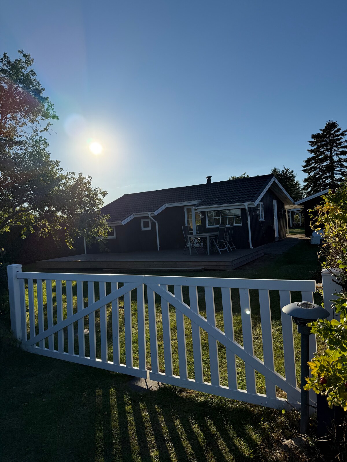 The house is located with the most beautiful view of the sea. There's a wooden terrace around the house. There is furniture on both sides and two sun loungers for relaxation. The house is furnished with a large bedroom with double bed and 2 smaller rooms with 120 cm beds. The bathroom is a reasonable size with a large shower room. The living room and kitchen are in one with plenty of room for everyone. The fireplace in the house is a bio fireplace. The trampoline is at your own risk. Please take off your shoes when using it.