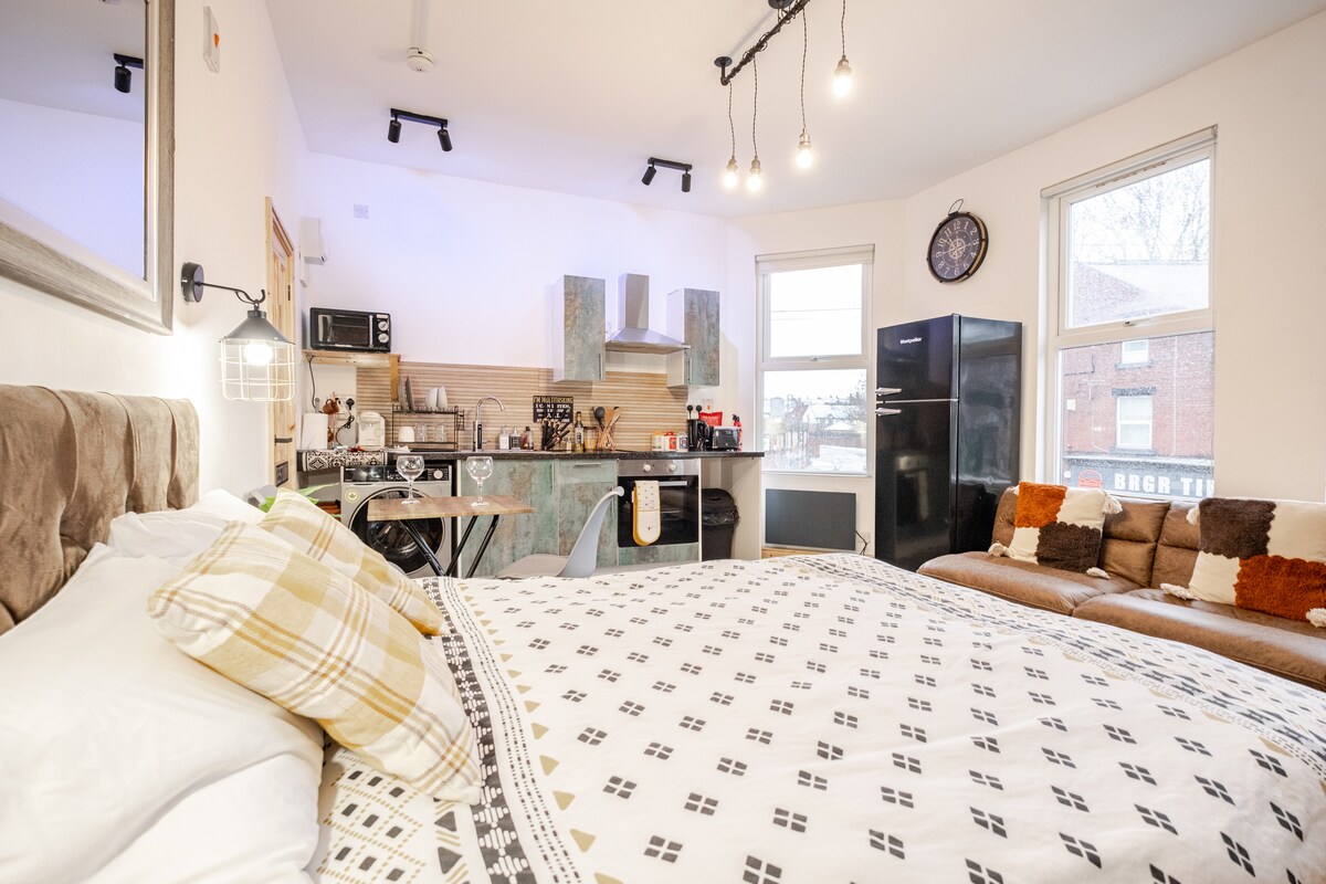 Hidden away beneath a terraced home on a quiet cul-de-sac, this peaceful studio apartment with private entrance is perfect for solo travellers or couples seeking calm with creative flair. Enjoy a comfy king-sized bed, underfloor heating, private ensuite, and a compact kitchenette. Just 10 minutes to Leeds city centre by bus (or a light 30-minute walk), you’re also very close to Versa Film Studios, two leafy parks, a handy bakery, plus a cheap, well-stocked local supermarket.