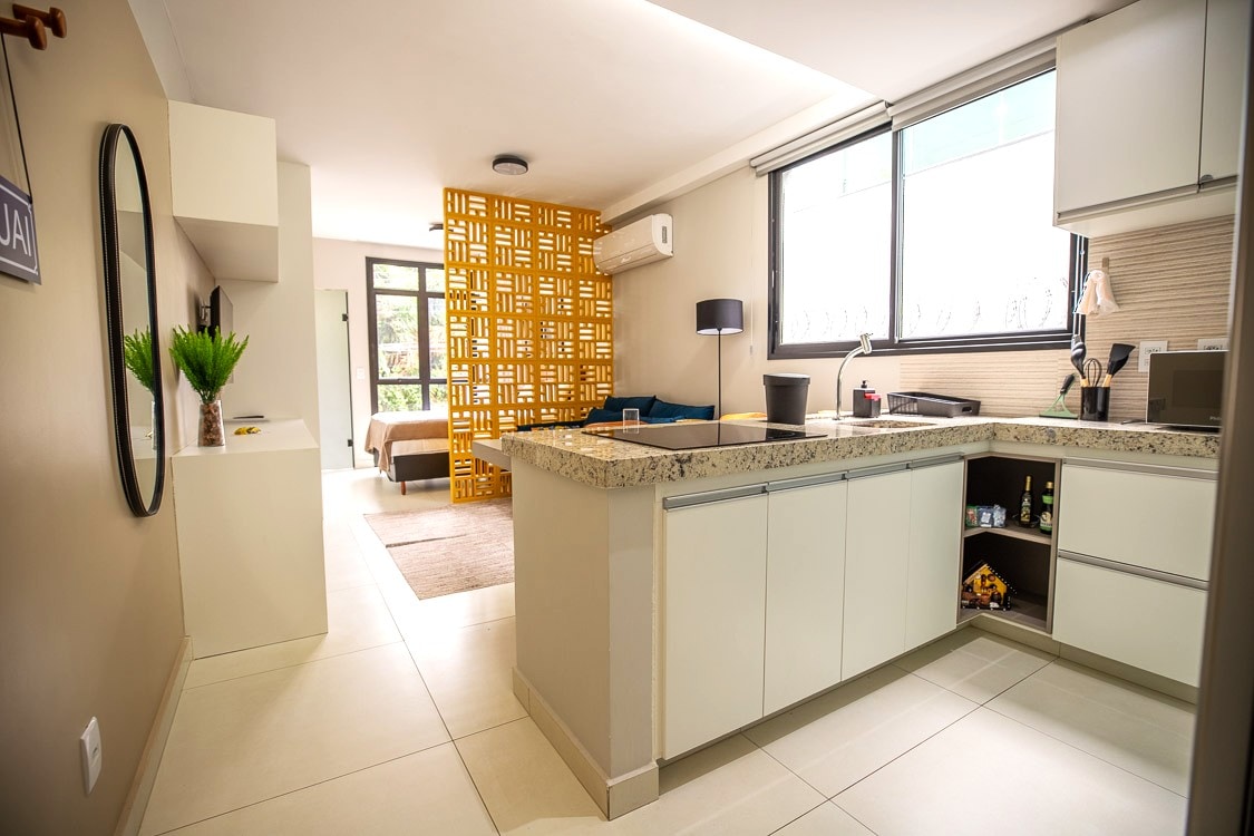 Decorated loft, well lit and airy, in front of the BH bus station square, close to shops, restaurants and tourist attractions. Military Police ahead. It has air conditioning and ceiling fans, a queen bed and a comfortable sofa bed. It has two Smart TVs, an electric oven, microwave, single-burner electric stove, coffee maker, electric pan and kettle, sandwich maker, iron and hair dryer. Mini market and gym on the mezzanine. It does not have its own parking space.