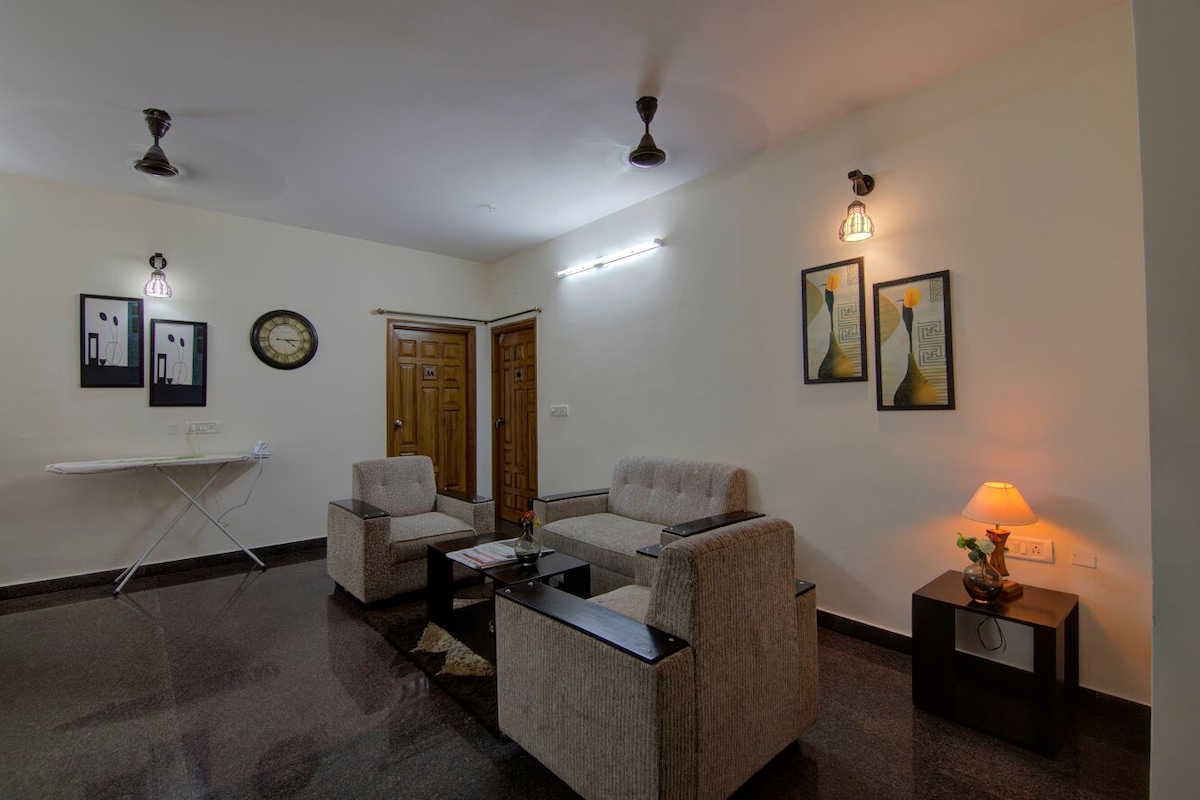 Spacious 600 square feet Designer 1BHK Suite with Private Balcony | High-Speed fibre optic Wi-Fi & Smart TV with streaming platforms, Work/Dining Desk, 24/7 power backup for uninterrupted work and comfort |Luxe King Bed & Orthopaedic Mattress ,wooden wardrobes for storage | fully equipped Kitchenette | Couch Bed in living room , Max.Occupancy 4 | Elevator access, professional housekeeping and access to paid laundry on site for long stays| Located in Central Bangalore | LGBTQIA++ Affirmative