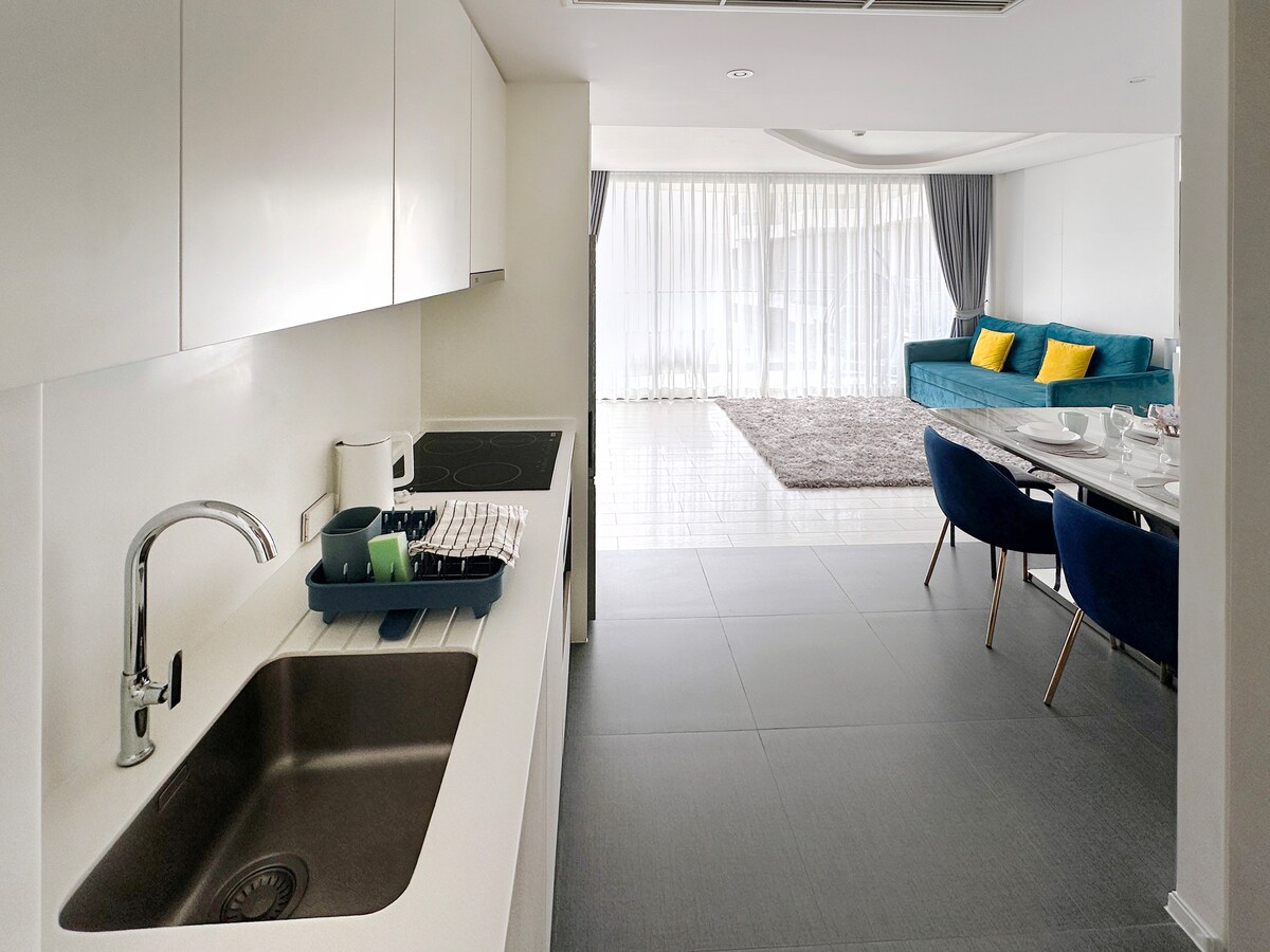 Spacious getaway directly at the beach with lush mountains in the back & the tranquil Pranburi forest park only 1 min away. Perfect for nature fans, sport lovers, remote workers or people who just want to relax The apartment has 2 bedroom, 2 bathroom incl. 1 bathtub, Sofa, TV, kitchen, working desk, balcony The building has a huge swimming pool, beachfront garden, Sauna, fitness gym & library Small local shops & restaurants in walking distance. Refill drinking water tap is under the sink.