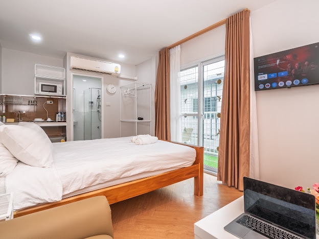 Newly renovated studio (1 King Bed + Private Bathroom) â close to MRT Huai Khwang âĒ Next to local night market & 7-11 convenience store âĒ Motorcycle taxi station right in our building âĒ 55inch smart TV with Netflix & YouTube âĒ Hotel grade bed and linens âĒ Staff at building 24 hours every day, guest can check-in anytime âĒ Luggage storage service before and after your stay âĒ Walking distant to many restaurants, bars, cafes, massage parlor âĒ 30 minutes from Bangkok Suvarnabhumi Airport